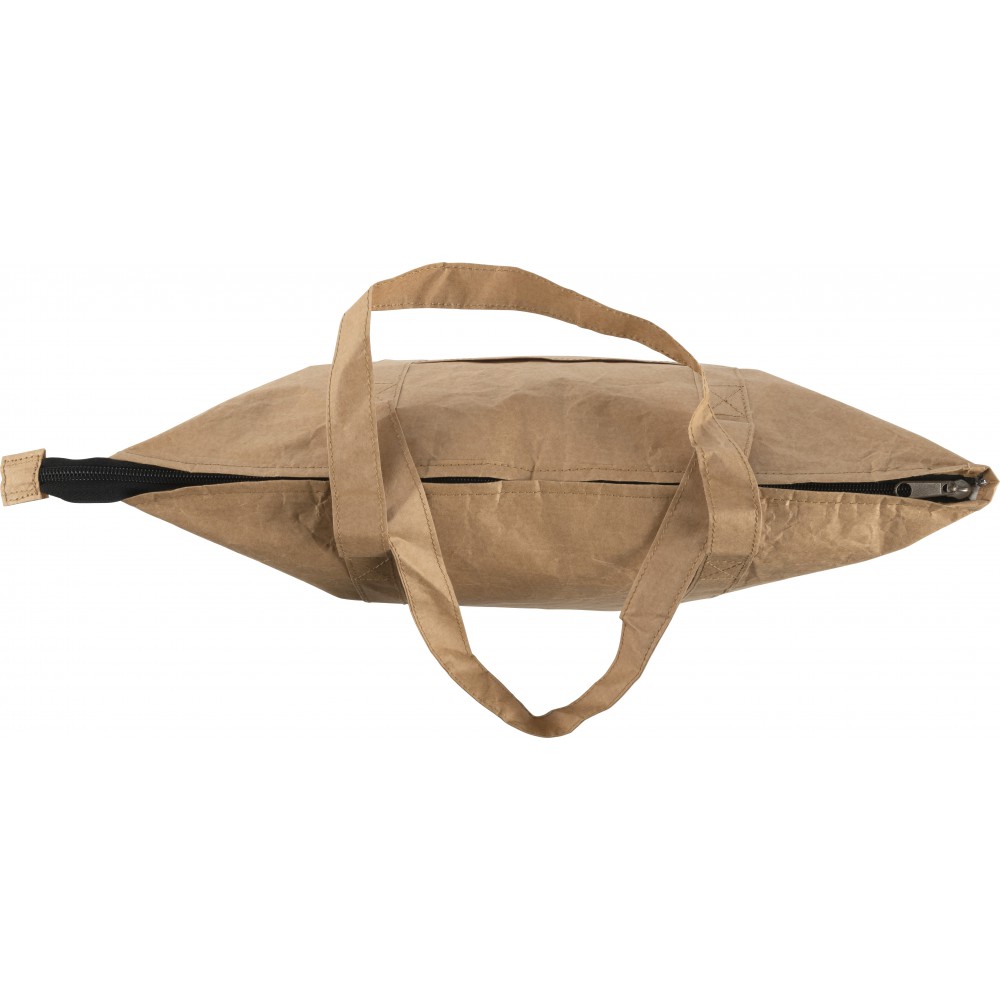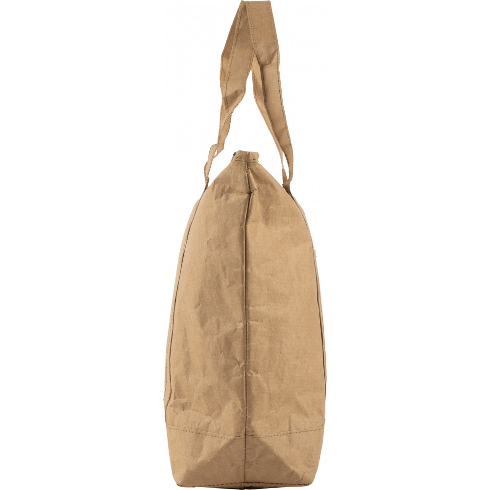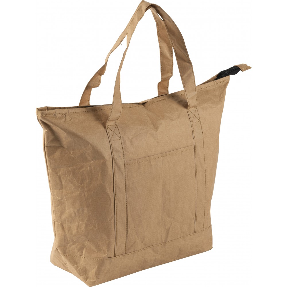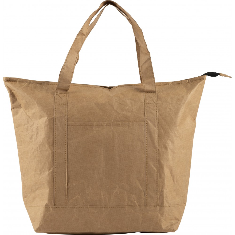 Laminált papír hűtőtáska és bevásárlótáska ezüst színű fóliabéléssel. Cipzáros fő rész oldalzsebbel. A zseb mérete: 16, 8 x 15, 6 cm. PE, alumínium fólia, 80 g papír.