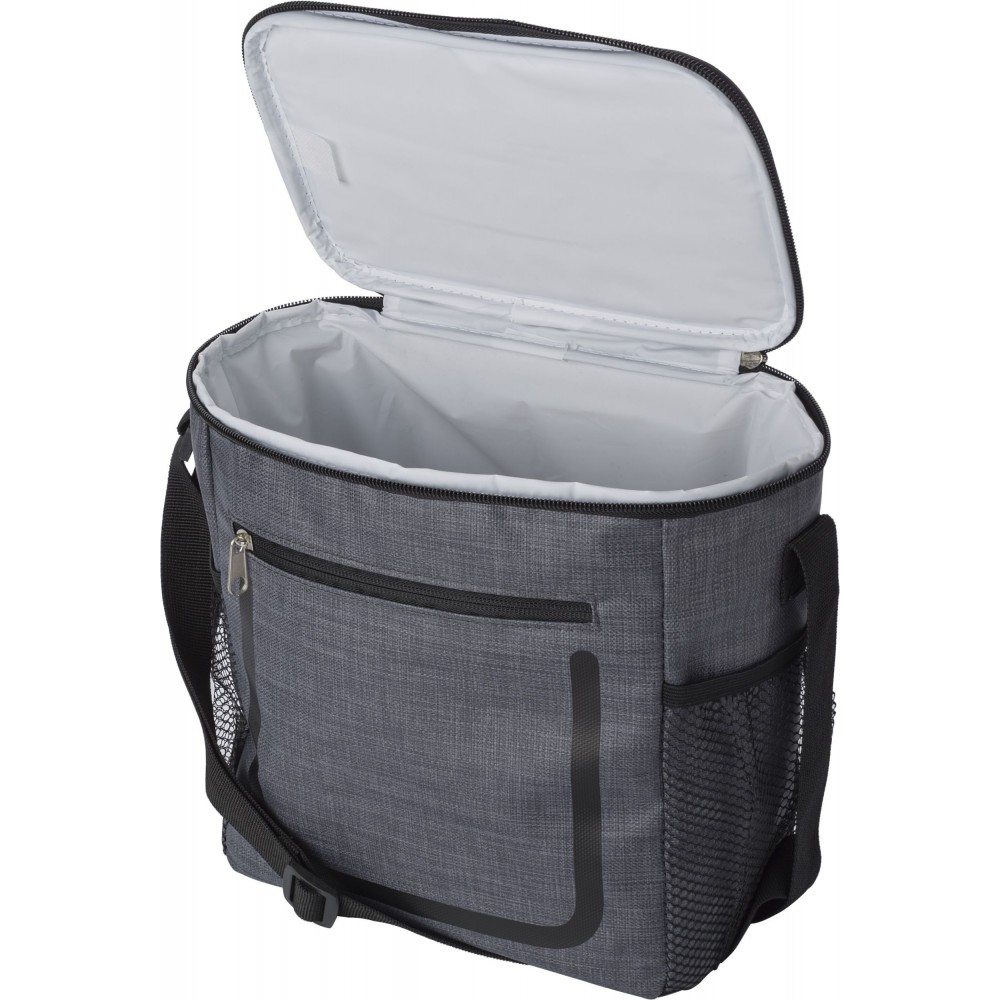 Hűtőtáska cipzáras elsőzsebbel és hálós oldalsó rekeszekkel. A belső rész fehér szigetelő fóliával van bélelve. A táska állítható vállpánttal rendelkezik. PE, PU műanyag.