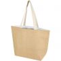 A stílusos Juta hűtőtáska erős és kopásálló laminált jutából készült. Egy nagy (12 literes) fő rekesszel bélelt élelmiszerbiztonsági alumínium szigeteléssel ellátott és tépőzáras felső zárással, amely az italokat, frissítőket és fagyasztott termékeket hosszabb ideig hűvösen és külső hatásoktól védve tartja. A táska hosszú fogantyúkkal (30 x 2,5 cm) szőtt pamutból készült, és extra széles aljú. OEKO-TEX tanúsítvánnyal rendelkezik. Juta, 300 g/m2.