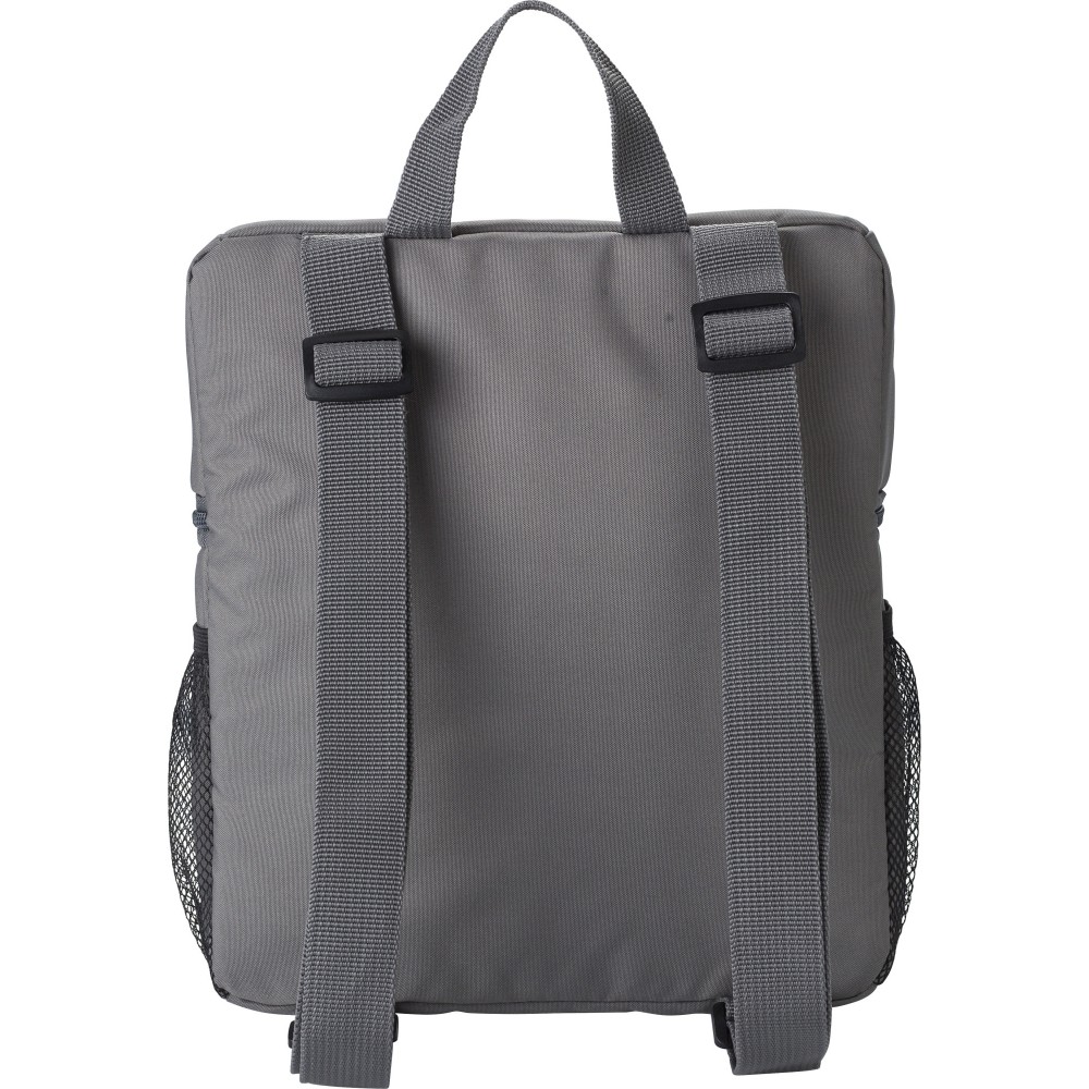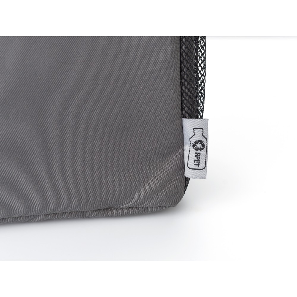 Újrahasznosított poliészterből (300D/PU RPET) készült hűtőhátizsák PEVA (13C) béléssel. Egy tépőzárral záródó elülső zseb, két hálós zseb az oldalán. Állítható vállpántok.