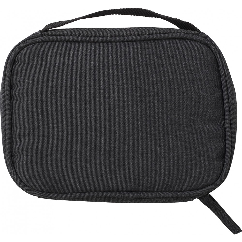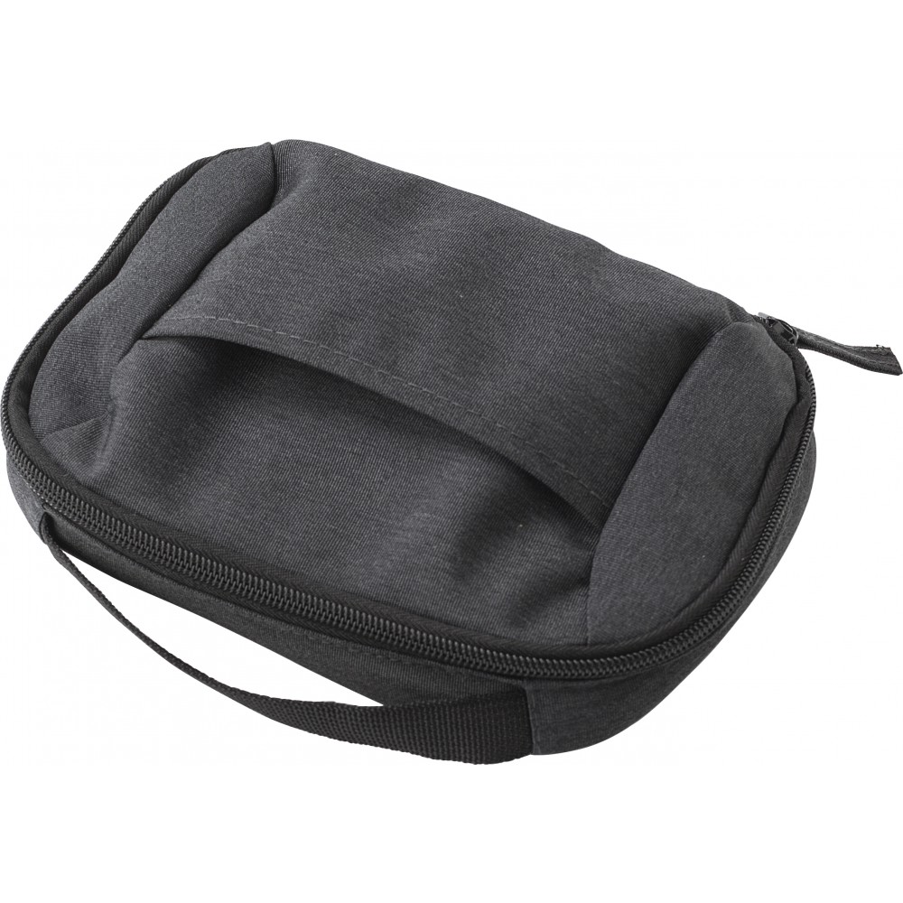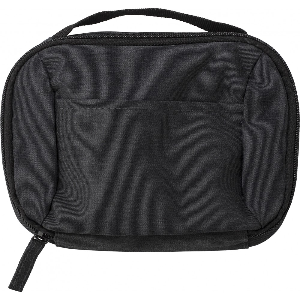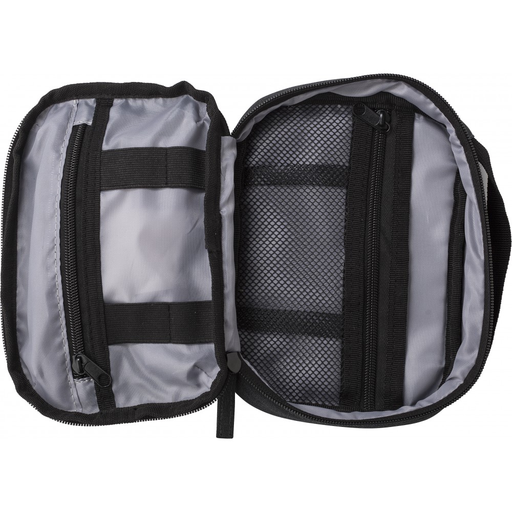Kistáska utazáshoz, 600D poliészter anyagból. Több kisebb tartózseb kábelek, utazási dokumentumok tárolására. Elöl egy nyitott zseb.