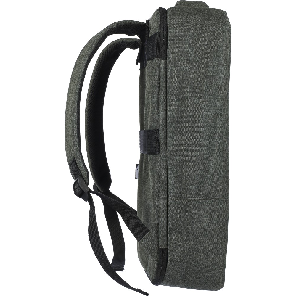 Laptophátizsák 300D rPET poliészter anyagból, 210D rPET béléssel. Egy nagy cipzáras rekesszel, számtalan belső zsebbel, tépőzáras laptoptartó zsebbel 15 -es laptop számára és 12 literes űrtartalommal. Megerősített, szellőző hátrésszel, állítható vállpánttal, oldalsó hordozófüllel és gurulóstáskára való felhelyezésre alkalmas pánttal. Teherbíró képesség: 10 kg.