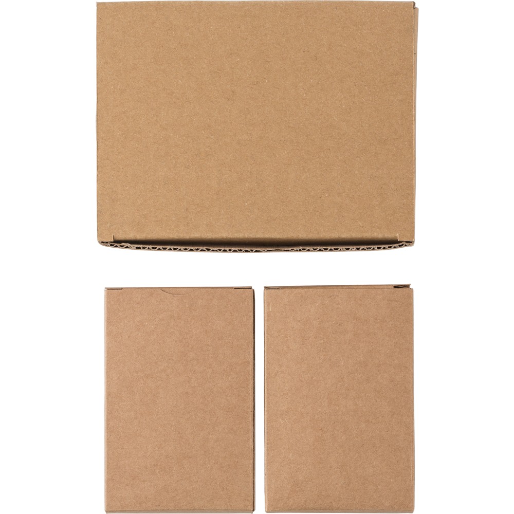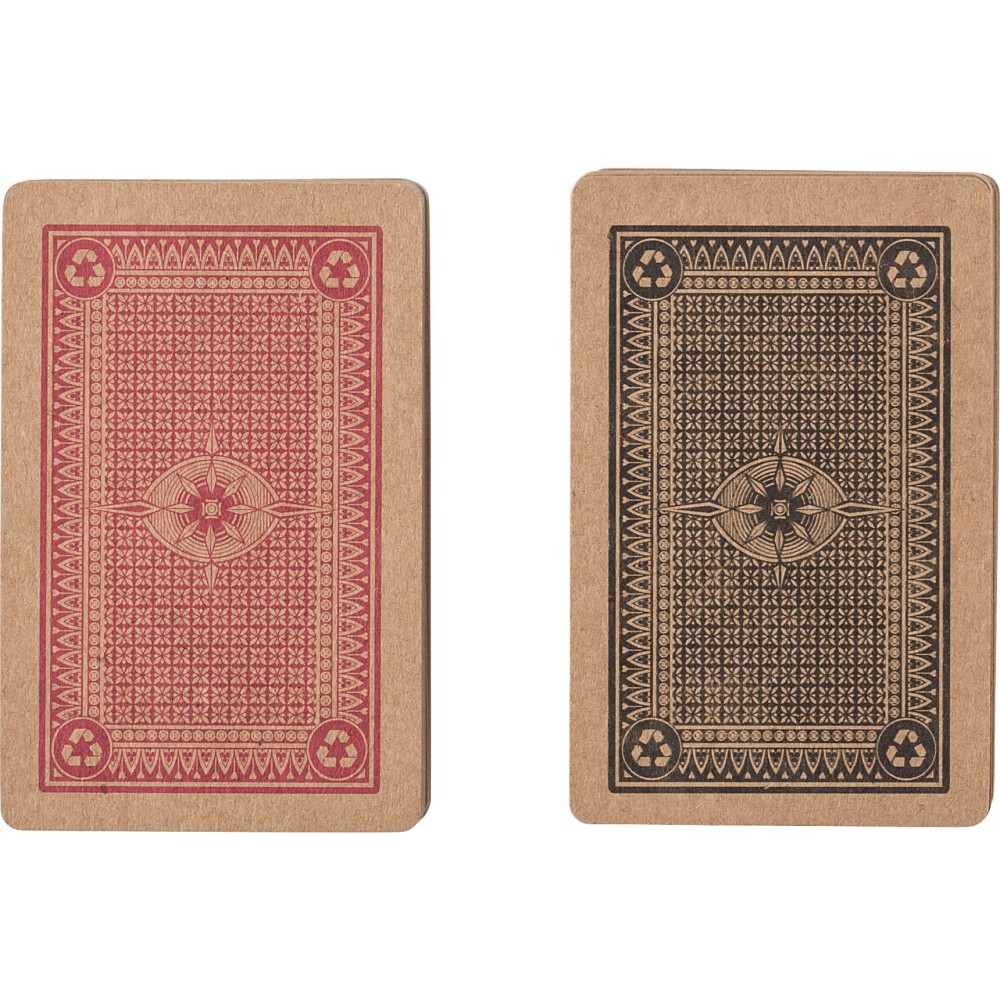 Újrahasznosított kartonból készült kártyapakli, két darabos készlet. Készletenként 54 kártya (52 kártya + 2 joker kártya). Paklinként kraftpapír dobozba csomagolva, és a két pakli együtt egy kemény dobozban.
