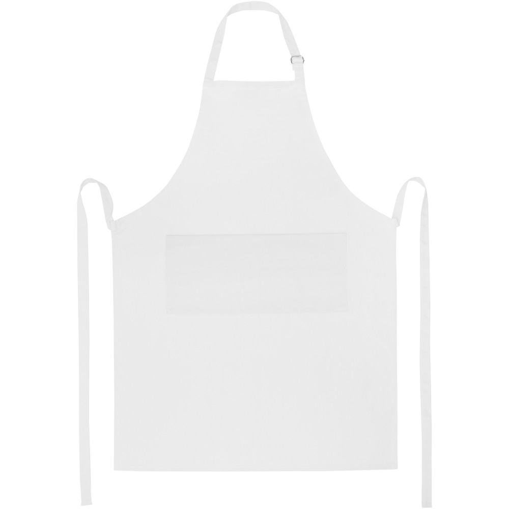 Vastag és masszív anyag, ugyanakkor puha és kényelmes viselet. A két elülső zseb gyors és egyszerű módot kínál a konyhai eszközök tárolására. A kötény nyakában csattal állítható, hátul megköthető. Nagyméretű nyomtatási lehetőség a logók megjelenítéséhez. Pamut twill 65% poliészterből és 35% pamutból, 240 g/m2.