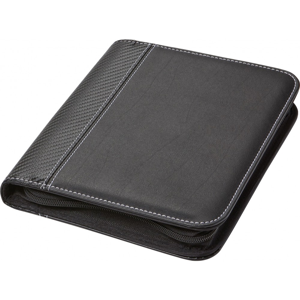 Cipzáros A5 irattartó PU borítással, fehér díszítő tűzésekkel, tolltartó hurokkal, hat különböző méretű zsebbel, 30 lapos, vonalas jegyzettömbbel, mikroszálas béléssel. A tollat nem tartalmazza.