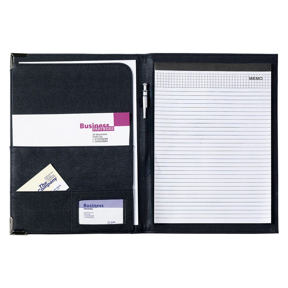 A4-es műbőr mappa fém sarokkal. Jegyzettömböt és tollat nem tartalmaz.