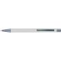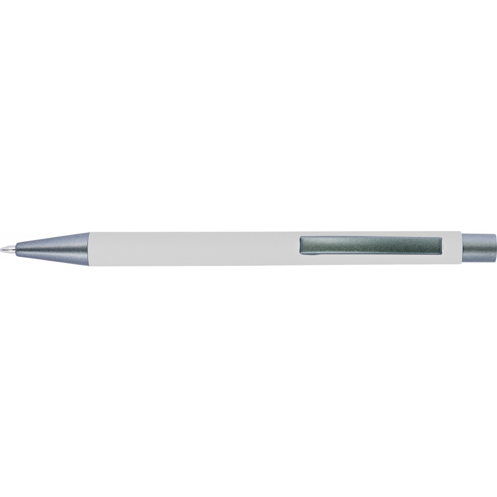 Golyóstoll gumis bevonattal, kék tollbetéttel. A hegy, klipsz és a nyomógomb egyforma sötétszürke színű. ABS, alumínium.