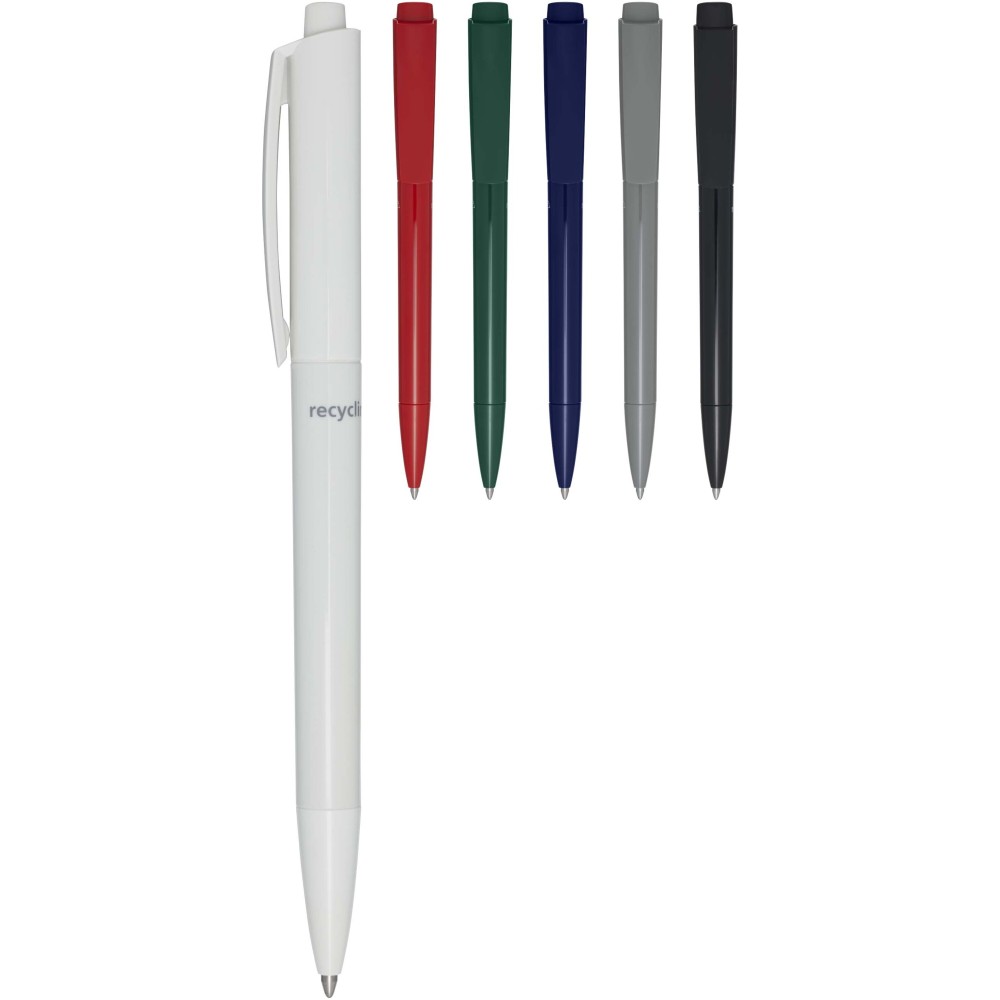 Golyóstoll, amelynek teste és klipsze újrahasznosított műanyagból, hegye pedig rozsdamentes acélból készült. Kék tollbetéttel. Íráshossz: 3000 méter. Hegyméret: 1,00 mm. Németországban készült.