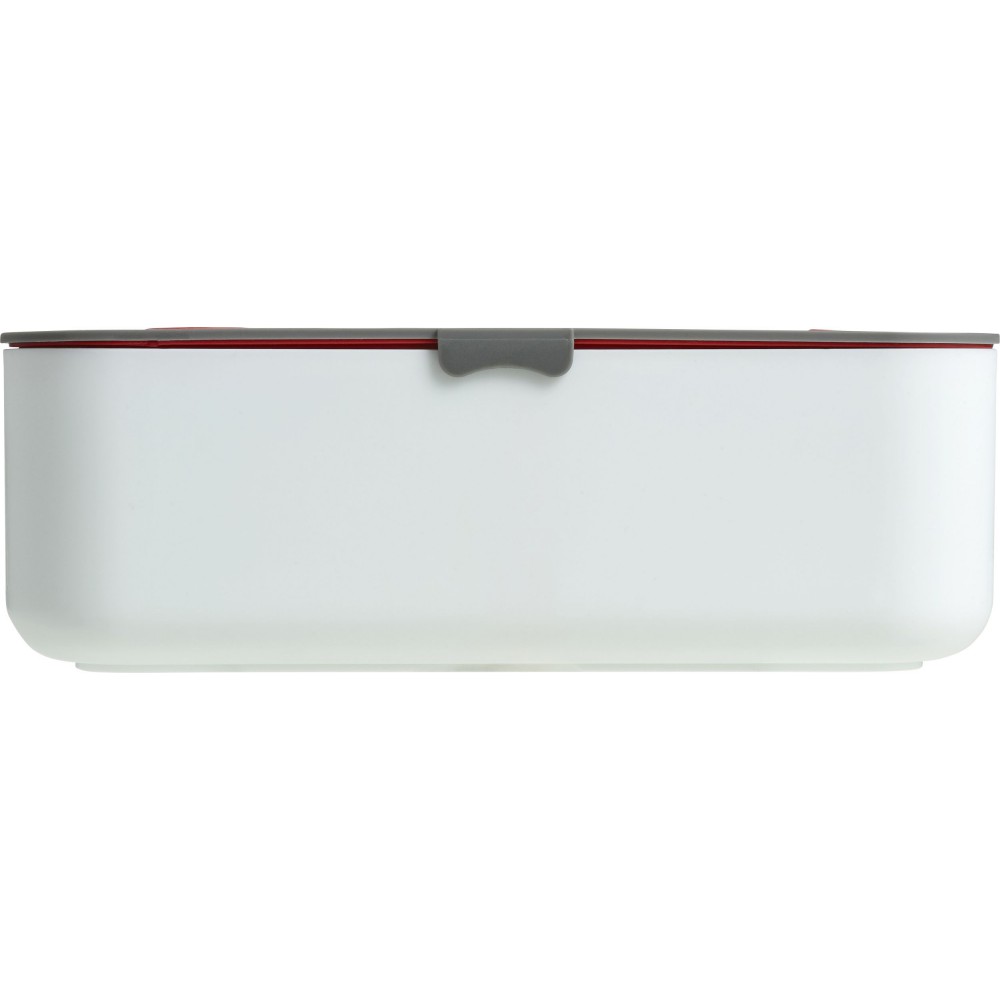 Ételdoboz egy belső elválasztóval. A fedélen lévő zárószerkezet telefontartóként is használható. Fedél nélkül mikrózható, csak a doboz. Űrtartalom: 850 ml. PP BPA-mentes műanyag.