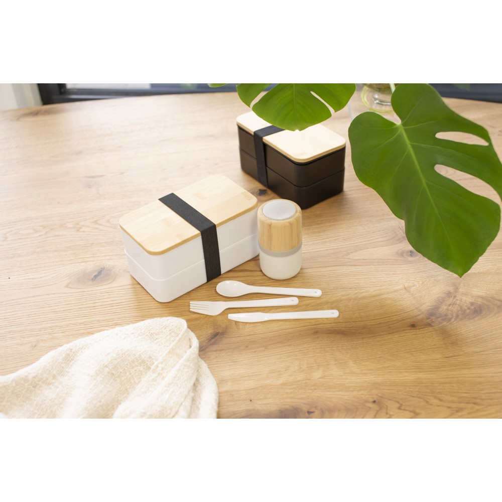 Kétrétegű uzsonnásdoboz több rekesszel (2 x 400 ml) és bambuszfedéllel. Tartalmazza az elválasztót és a műanyag evőeszközöket (kanál, villa és kés), valamint a rugalmas szalagot. PP.