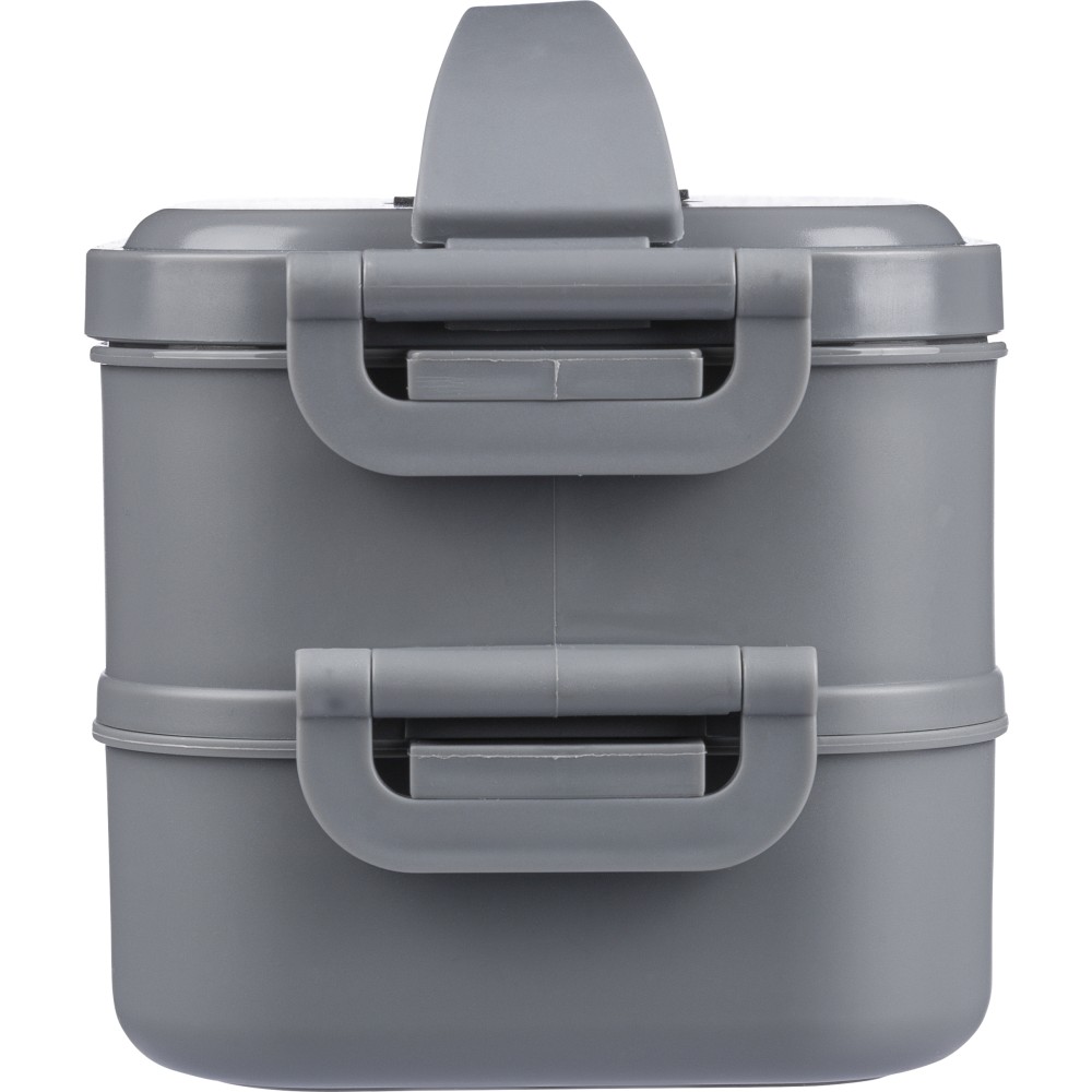 1600 ml-es PP ételtároló doboz 2 db, egyenként 800 ml-es résszel. Szilikon szeleppel a mikrohullámú sütőben történő melegítéshez, csatos záródással és szilikon hordozófüllel. Mosogatógépben tisztítható.
