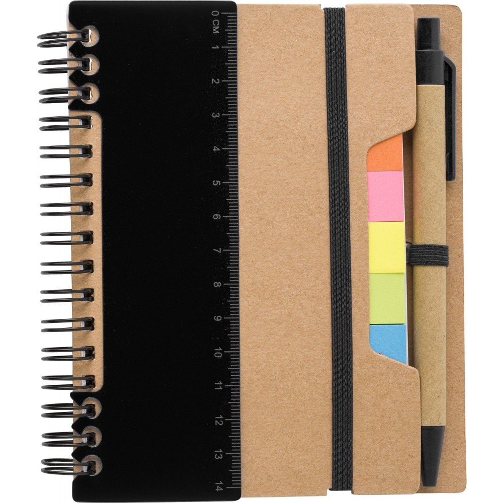 Spirálnotesz újrahasznosított papírból 60 vonalas lappal, öntapadó jegyzetlapok 5 színben, vonalzó és toll kék tollbetéttel.