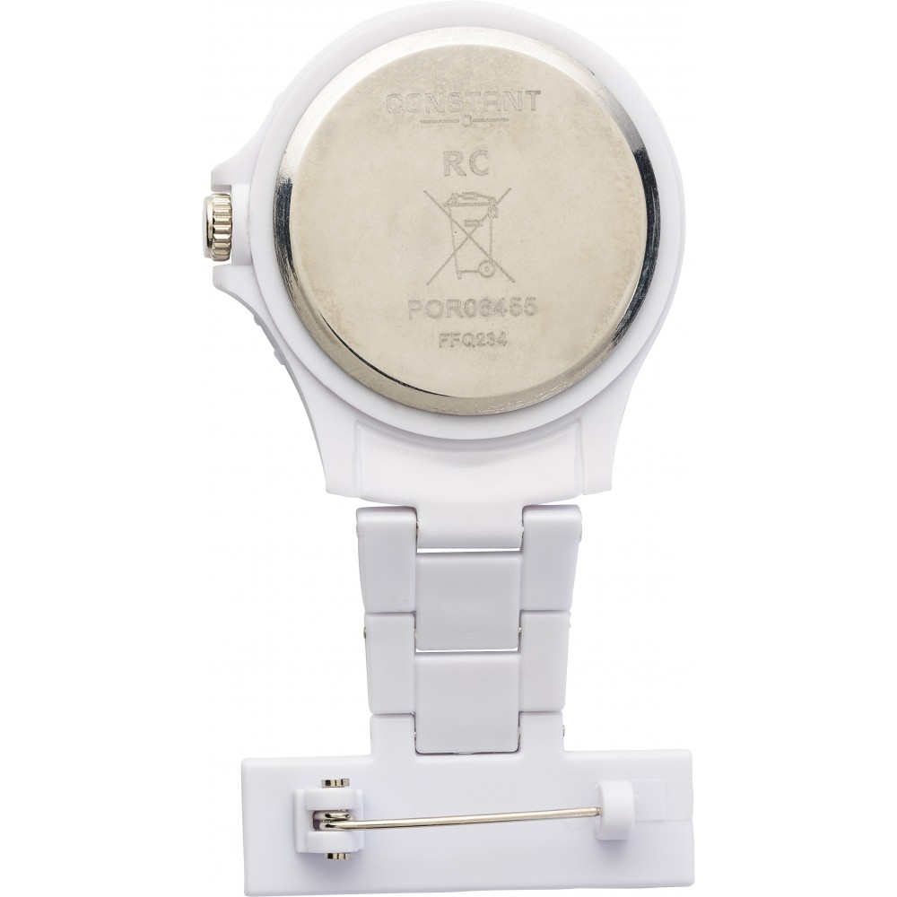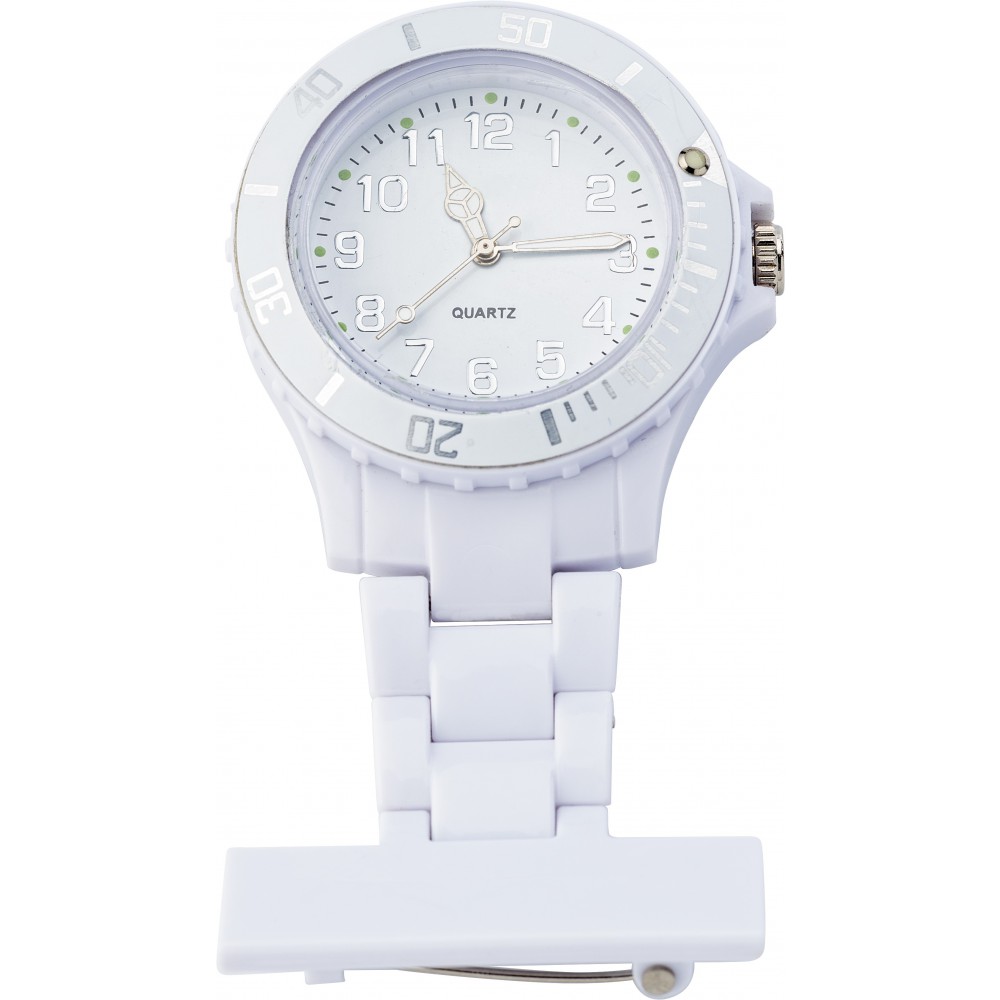 Orvosok, ápolók számára készült óra, mely a köpeny mellzsebére tűzve viselője számára egyetlen fejbiccentéssel lehetővé teszi, hogy megtudja a pontos időt.