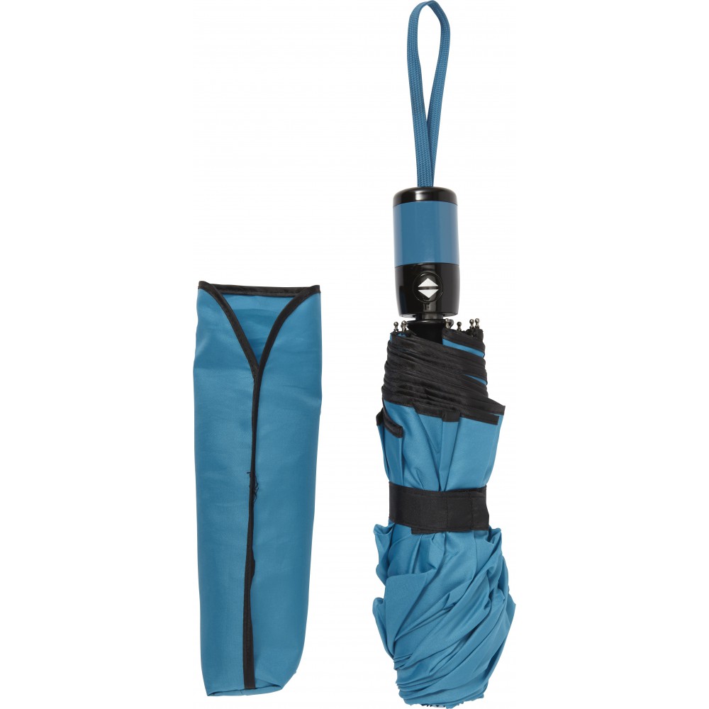 Összecsukható automata esernyő fém vázzal, üvegszálas bordákkal, műanyag fogóval, tokkal.