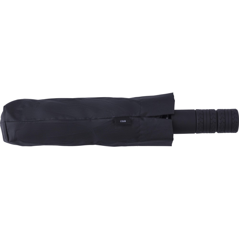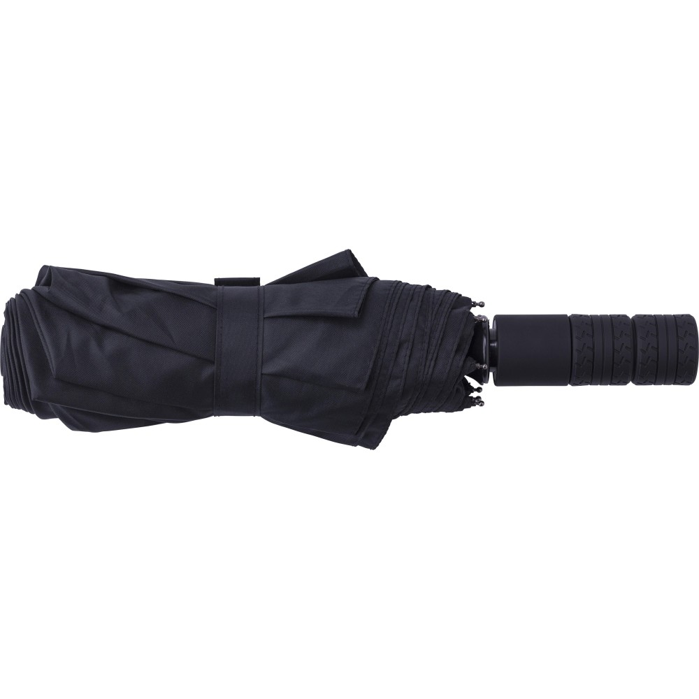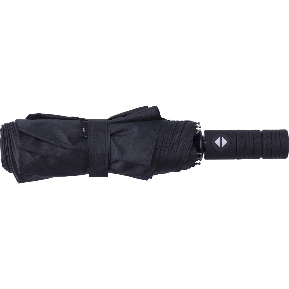 Automata nyitású és zárású, összecsukható esernyő 8 panellel, tokkal. Nyele gumis mintázatú, az autók abroncsára emlékeztet. Vászna RPET pongee anyag. Mérete: 21 .