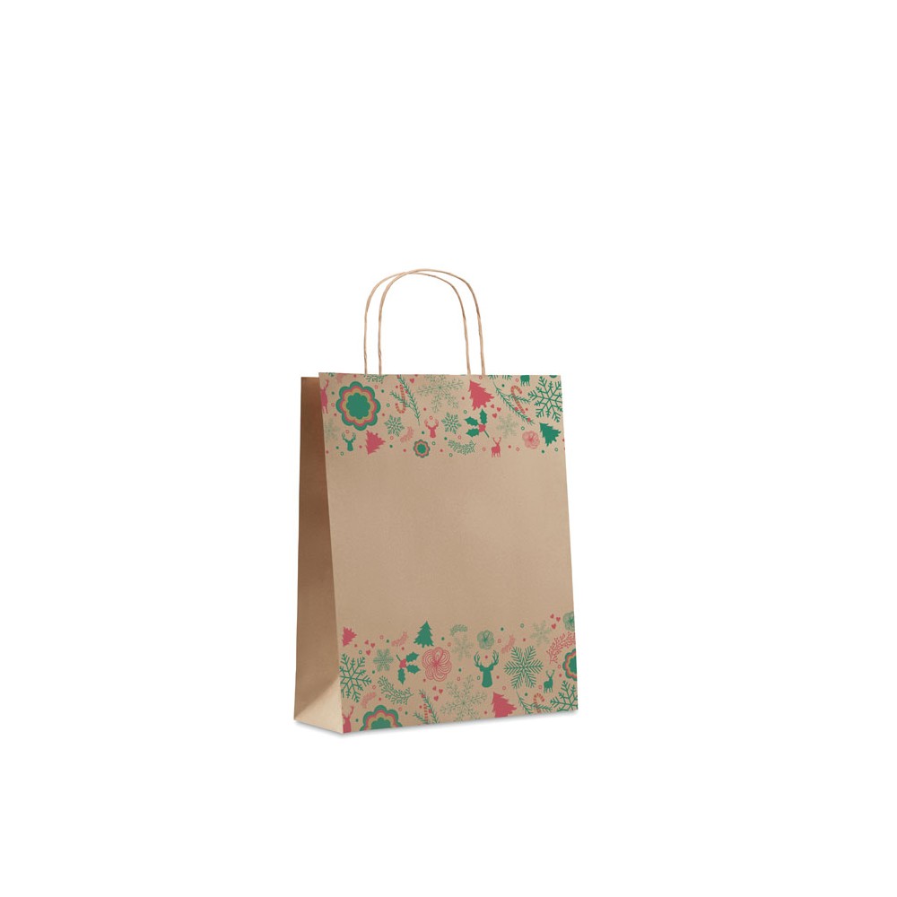 Közepes papír karácsonyi ajándéktasak. 90 g vastag, 50%-ban újrahasznosított papír. EU-ban gyártva.
