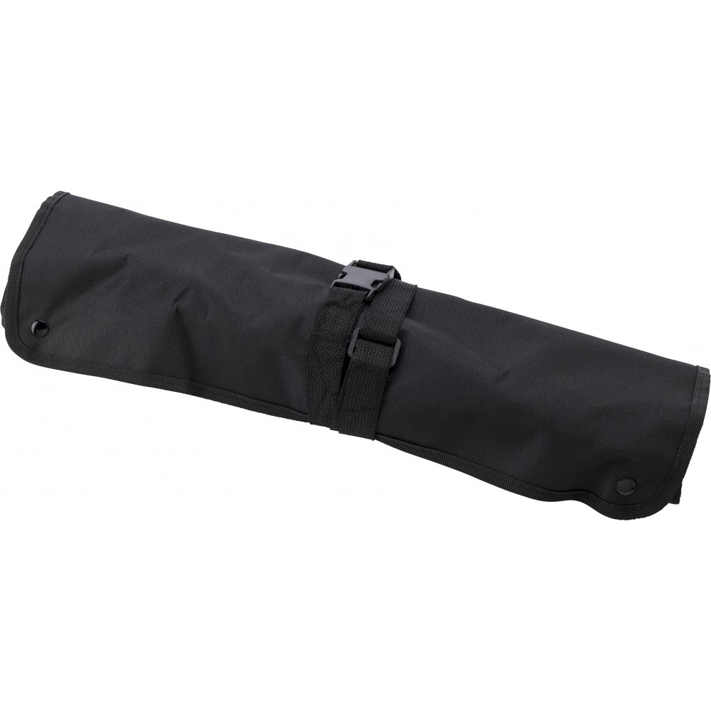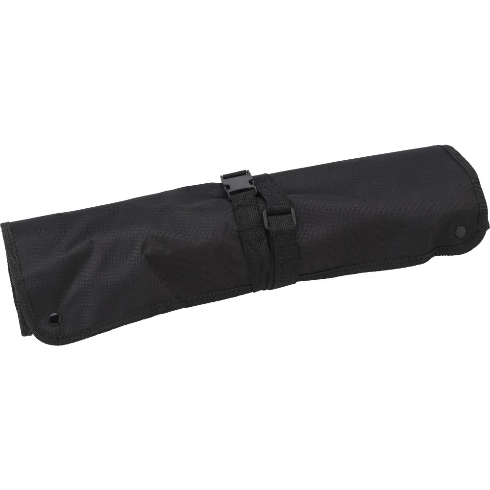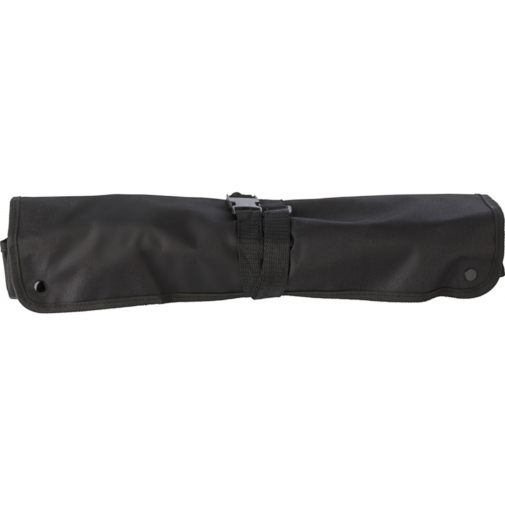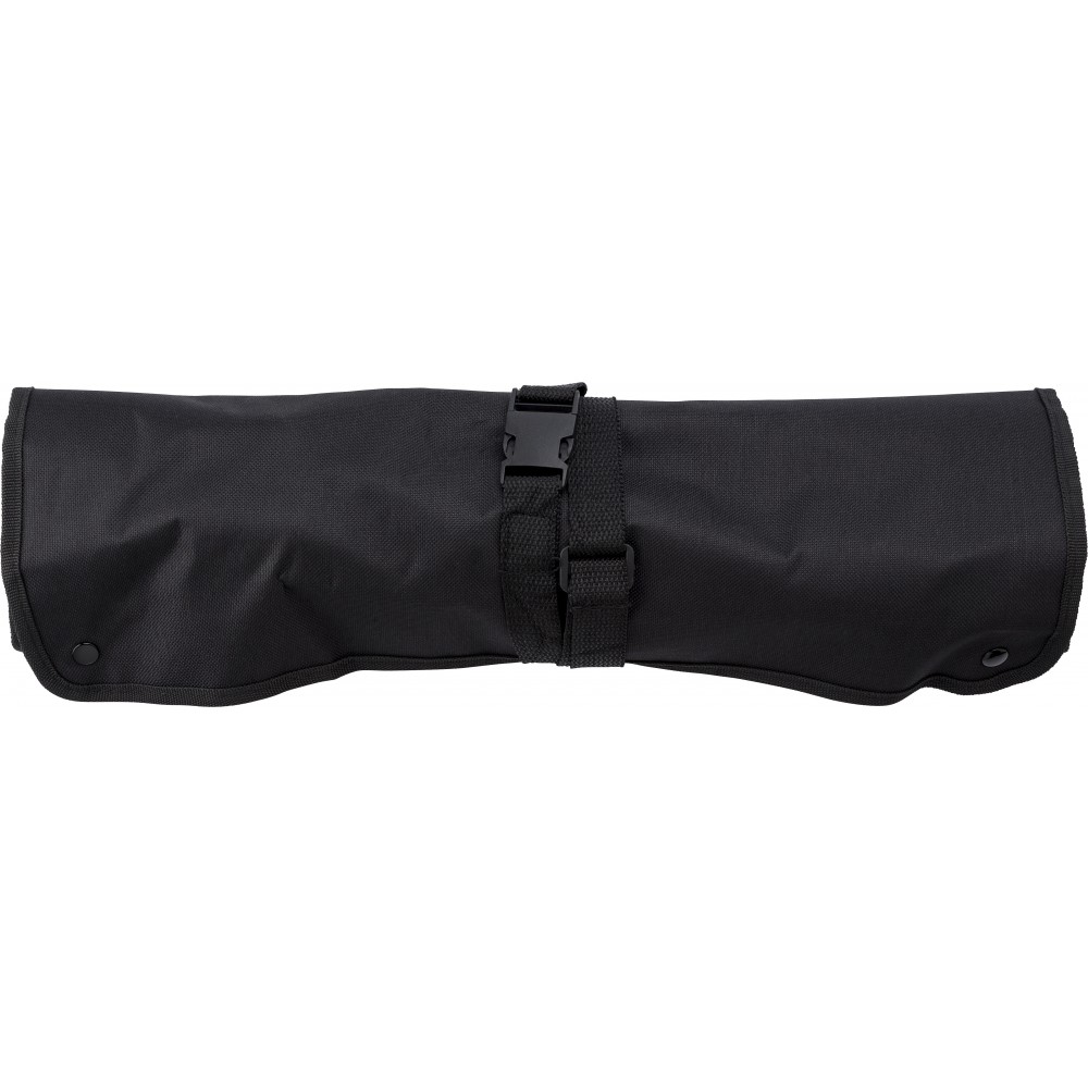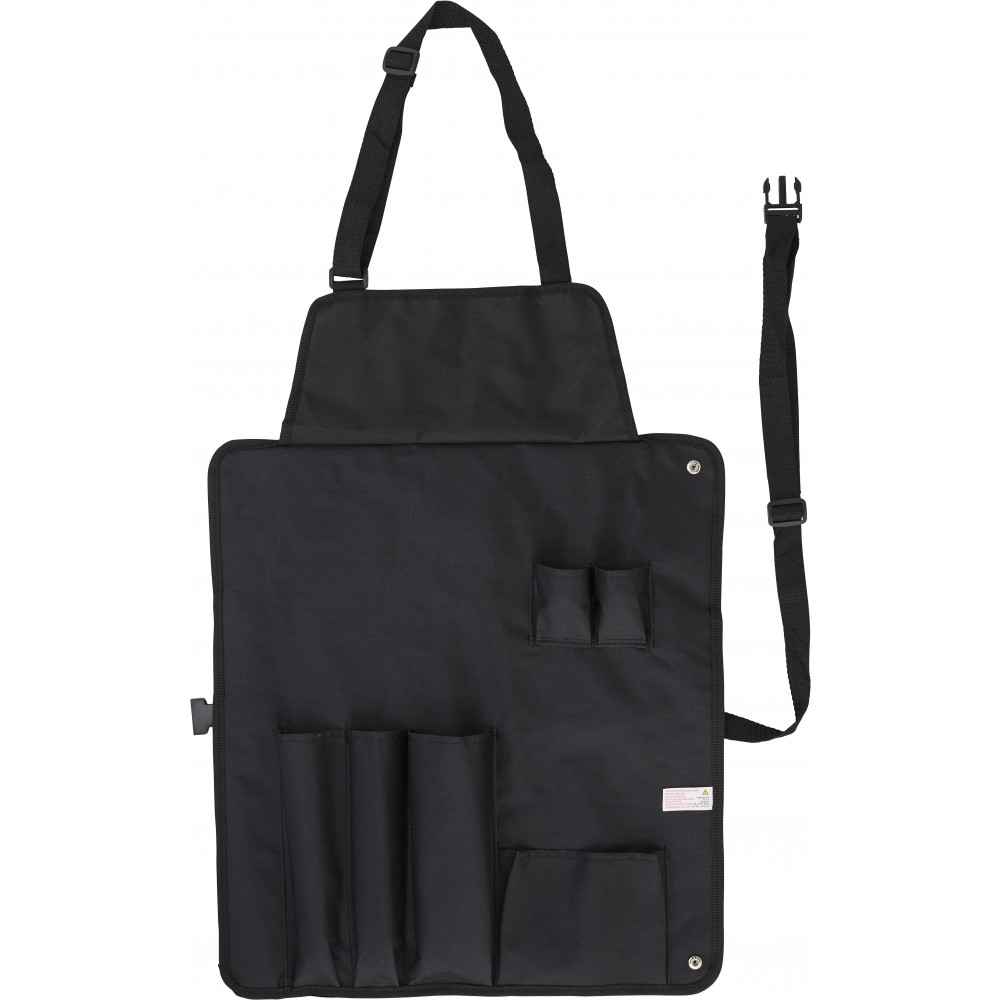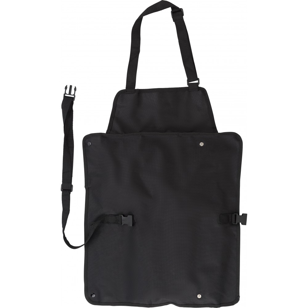 Barbecue kötény. A zsebek tartalma: hússütő villa, kés, fogó, lapát, só- és borsszóró.