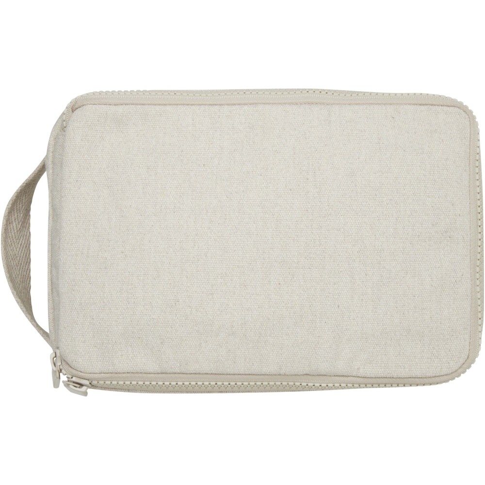 Piperetáska 500 g/m2 újrahasznosított pamutból és poliészterből, tágas fő rekesszel, biztonságos cipzáras záródással és több belső zsebbel, amely ideális piperecikkek tárolására. Sokoldalú kialakításának köszönhetően kisebb tárgyak - például zoknik vagy töltők - rendszerezésére is kiváló, így a csomagok rendezetten tarthatók. A táska Cyclo újrahasznosított szálakat tartalmaz, amelyek előválogatott hulladékból készülnek, és ennek megfelelően alakul a fonal színe is. Ezek a szálak nemcsak a primer nyersanyagok iránti igényt csökkentik, hanem elköteleződést is mutatnak a körforgásos szemlélet iránt, elősegítve a hulladékcsökkentést és a zárt rendszerű gyártást. Minden táskához tartozik egy Aware nyomkövető is, amelynek QR-kódja révén nyomon követhető a termék eredete és útja, ezáltal fokozva az ellátási lánc átláthatóságát, és erősebb kapcsolatot teremtve a felhasználó és a termék gyártási folyamata között.