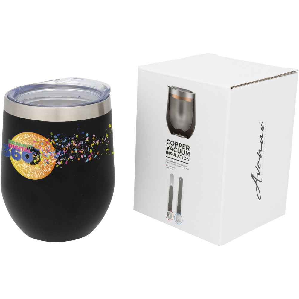 Rozsdamentes, rézbetétes szigetelésű, duplafalú vákumos pohár csavaros fedéllel. Kialakításának köszönhetően a páralecsapódás nem alakul ki. Hőtartóképesség 8 óra, hidegtartó képesség 24 óra. Nem szivárgásmentes. Szénsavas italokkal is használható. Mosogatógépben nem mosható és mikrohullámú sütőben történő melegítésre nem alkalmas. Űrtartalom: 350 ml. Csomagolása Avenue ajándékdoboz. Rozsdamentes acél.