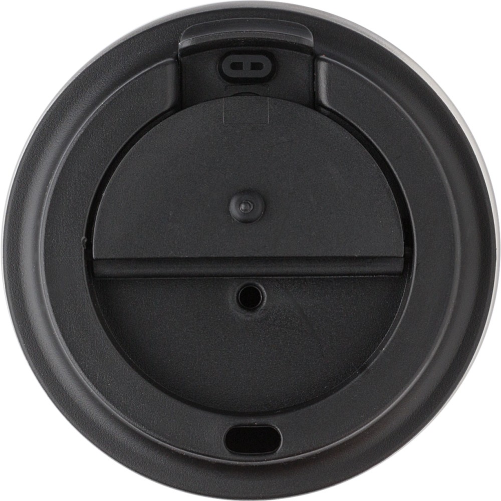 Rozsdamentes acélból és PP-ből készült utazópohár (350 ml). A PP fedél szilikon zárógyűrűvel rendelkezik, tetején lehajtható záróelemmel. Egyedileg csomagolva barna kartondobozban érkezik.