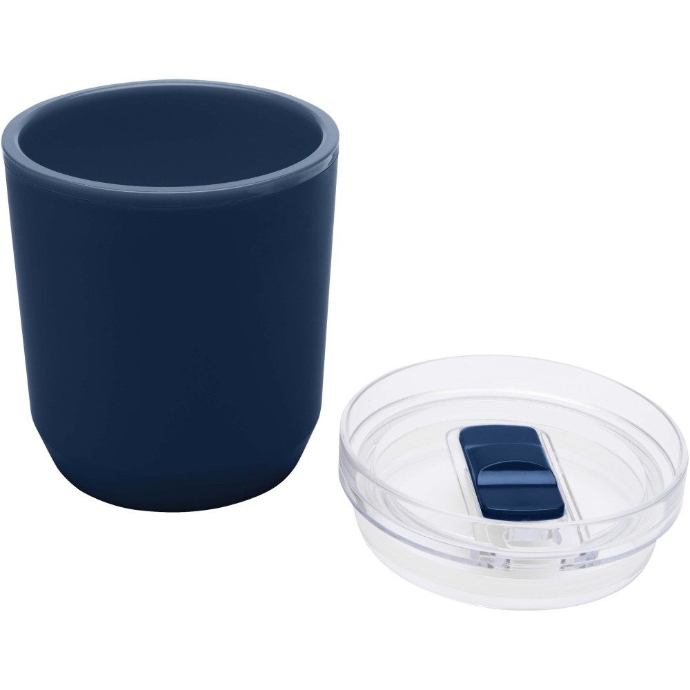 Egyszerű kialakítású termoszbögre, amely a legtöbb kávégéppel és autós pohártartóval kompatibilis. Dupla falú szerkezettel rendelkezik, újrahasznosított PP műanyag külsővel és PP műanyag belsővel. A csúsztatható fedél AS és PP műanyagból készült. Űrtartalma: 180 ml.