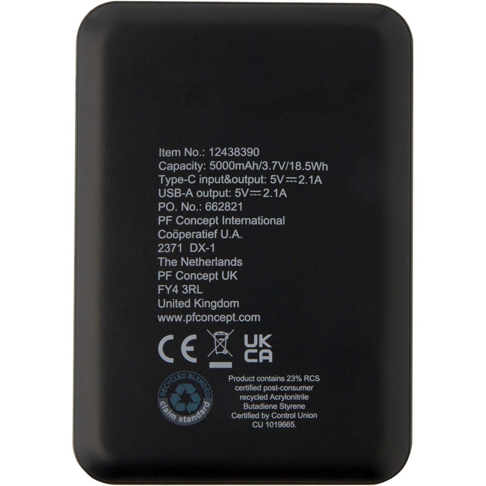 Karcsú és elegáns kialakítású powerbank, Type-C bemeneti/kimeneti porttal és 2 db USB-A porttal, amelyek lehetővé teszik három eszköz egyidejű töltését. A powerbank 5000 mAh kapacitású lítium-polimer akkumulátorral rendelkezik, amely max. 10W teljesítményt biztosít. A powerbank 23%-ban RCS tanúsítvánnyal rendelkező újrahasznosított műanyagból készült. TPE Type-C - USB-A töltőkábellel szállítjuk.