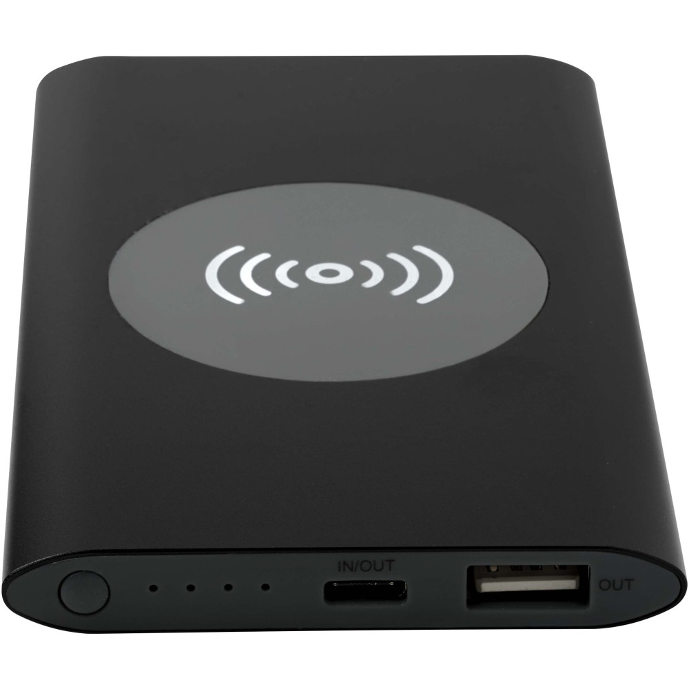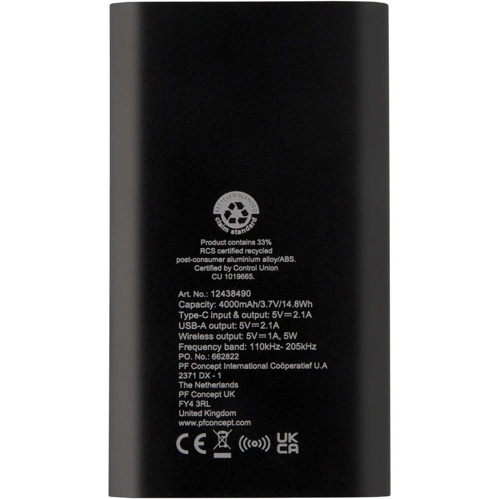 Powerbank Type-C bemeneti/kimeneti porttal és USB-A porttal, amely lehetővé teszi két eszköz egyidejű töltését. Támogatja az 5W vezeték nélküli töltést minden Qi-kompatibilis eszköz számára. A powerbank 4000 mAh kapacitású lítium-polimer akkumulátorral rendelkezik, amely max. 10W teljesítményt biztosít. A powerbank 28%-ban RCS tanúsítvánnyal rendelkező újrahasznosított műanyagból készült. TPE Type-C - USB-A töltőkábellel szállítjuk.