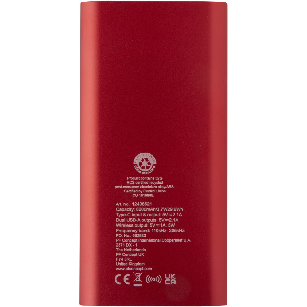 Powerbank Type-C bemeneti/kimeneti porttal és 2 db USB-A porttal, amelyek lehetővé teszik három eszköz egyidejű töltését. Támogatja az 5W vezeték nélküli töltést minden Qi-kompatibilis eszköz számára. A powerbank 8000 mAh kapacitású lítium-polimer akkumulátorral rendelkezik, amely max. 10W teljesítményt biztosít. A powerbank 28%-ban RCS tanúsítvánnyal rendelkező újrahasznosított műanyagból készült. TPE Type-C - USB-A töltőkábellel szállítjuk.