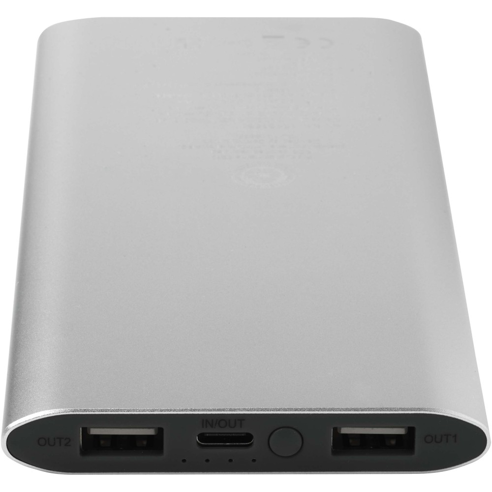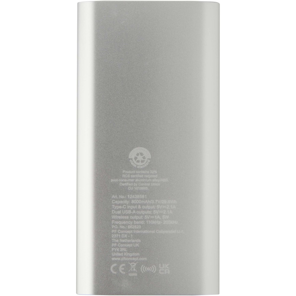 Powerbank Type-C bemeneti/kimeneti porttal és 2 db USB-A porttal, amelyek lehetővé teszik három eszköz egyidejű töltését. Támogatja az 5W vezeték nélküli töltést minden Qi-kompatibilis eszköz számára. A powerbank 8000 mAh kapacitású lítium-polimer akkumulátorral rendelkezik, amely max. 10W teljesítményt biztosít. A powerbank 28%-ban RCS tanúsítvánnyal rendelkező újrahasznosított műanyagból készült. TPE Type-C - USB-A töltőkábellel szállítjuk.