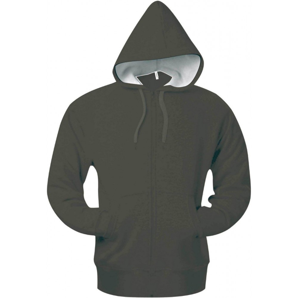 80% pamut és 20% poliészter. Belül bolyhos anyag, szilikonos mosással kezelve. Szürke színű szalagerősítés a nyakban és kapucnibélés, kenguruzseb, bordás ujj- és derékpasszé, YKK cipzár. 360 g/m2.