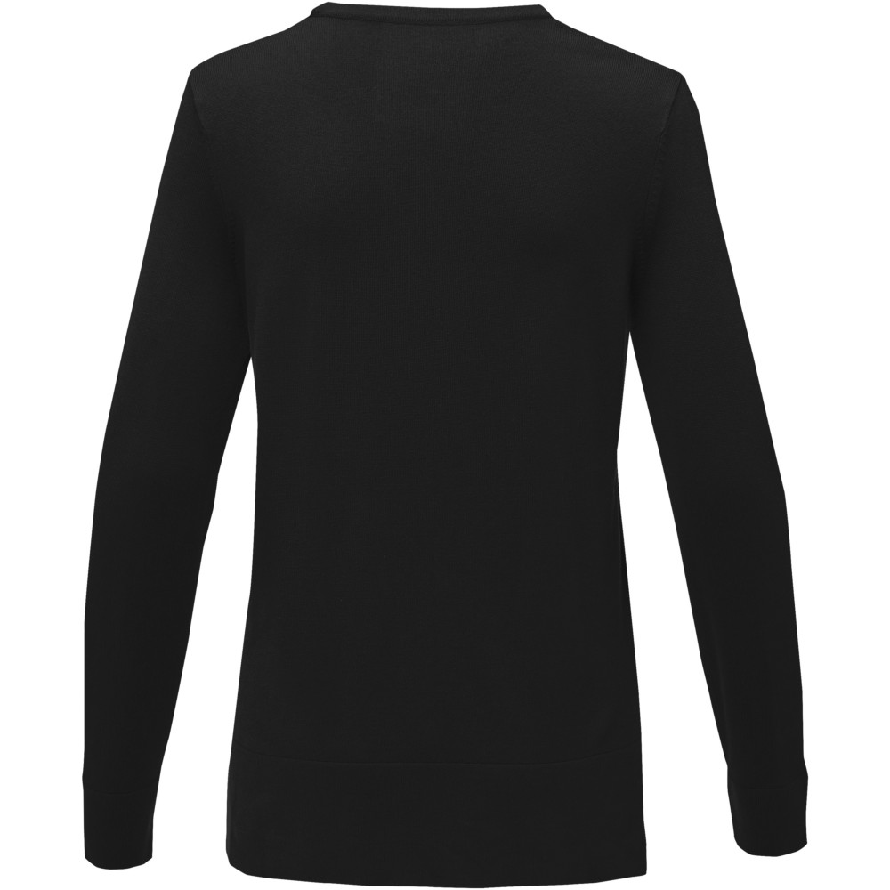 Kereknyakú pulóver. Lapos kötésű bordás nyak, alj és kézelő. Hátul hosszított fazon oldalsliccel. Szaténszalaggal erősített nyakvonal. 12 gauge. 80% viszkóz és 20% nylon.