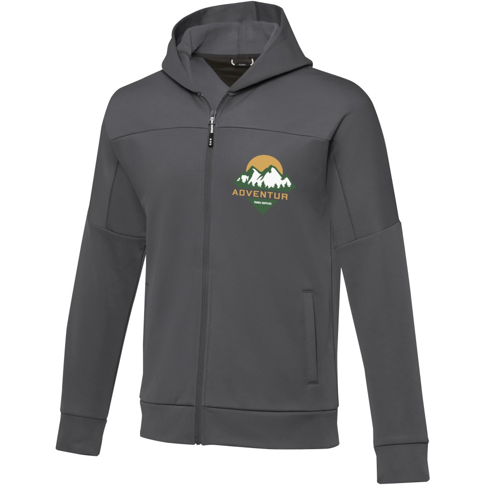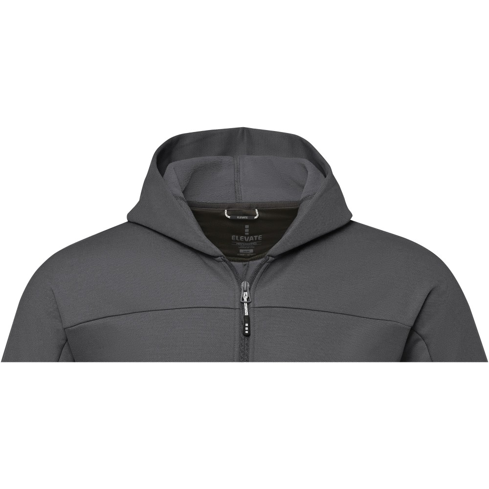 Középen elöl fordított cipzár. Elülső zsebek. Márkázott akasztó. Szatén nyakszalag. Belső médiakimeneti port kábelvezetővel. Félhold betét a nyaknál. Kötött 70% poliészterből és 30% Sorona ( r) anyagból, 245 g/m2.