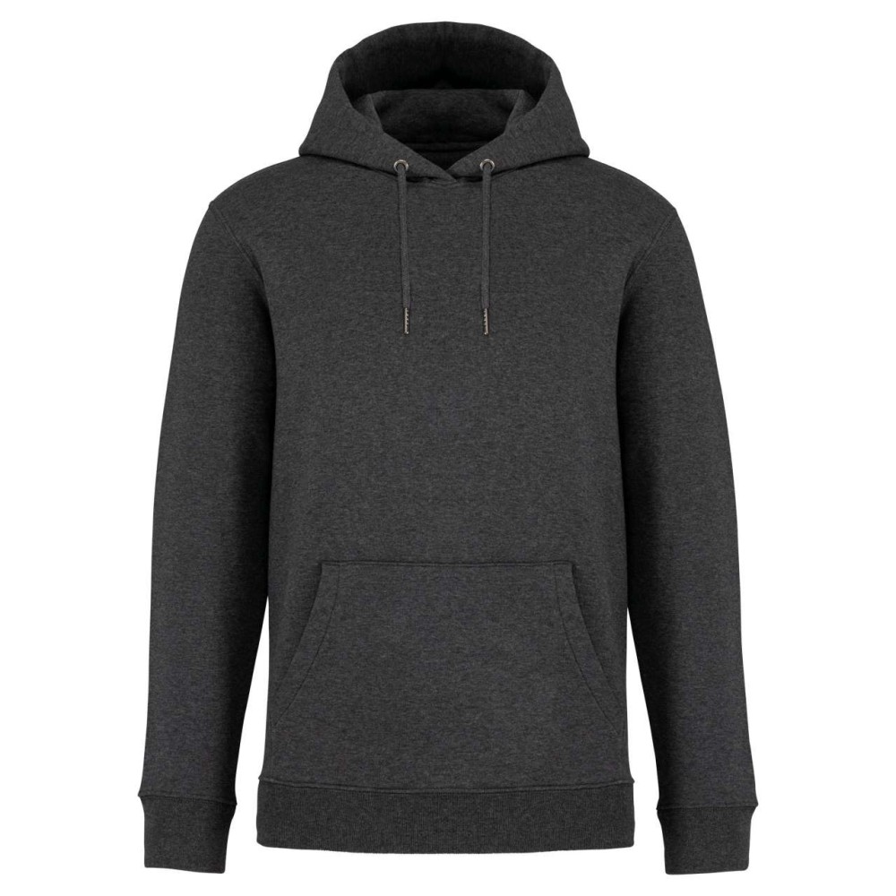 85 % bio, fésült pamutból és 15 % újrahasznosított poliészterből készült. Unisex. Egyenes szabás. Méretcímke organikus pamut és újrahasznosított poliészter logóval. LSF (Low Shrinkage Fleece: előzsugorított polár) kezelés. Kapucni. 1x1 bordás szegély és kézelő. Duplatűzés a kézelőn, a szegélyen és a nyaknál. Szalagozott nyakbelső hátul. Bélelt kapucni, a nyaknyíláson nincs felülvarrás, csak egy megkötés, hogy a húzózsinór a felső részen maradjon. Kerek húzózsinór a kapucnin fém véggel. Kenguru zseb. Nincs márkajelzés a nyakrészen, csak egy méretcímke a könnyű dekorálás érdekében. Karton függőcímkével érkezik, amely felsorolja a termék előállításához felhasznált környezetbarát anyagokat. Organikus pamutfonal. OEKO-TEX N CQ1007/7 STANDARD 100 tanúsítvánnyal rendelkezik. IFTH. 350 g/m2.
