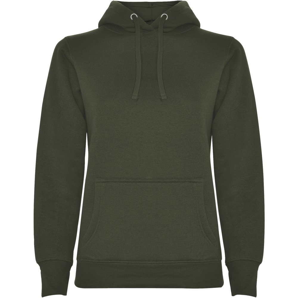 Kapucnis, karcsúsított, duplarétegű pulóver állítható húzózsinórral, nyaki szalagerősítéssel és kenguru zsebbel. A női modell kézelőjén hüvelykujj-nyílás. 1x1 bordás alj- és kézelőpasszé. 50% pamut és 50% poliészter, 280 g/m2.