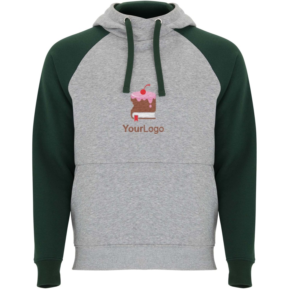 Két színű uniszex kapucnis pulóver. Kapucni keresztezett nyakrésszel és fém kiegészítőkkel. Kontrasztos belső rész a kapucnin, húzózsinór és raglán ujjak. Kenguru zseb. Rugalmas 1x1 passzék és alj. Levehető címke.
