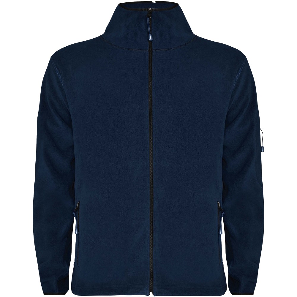 Mikroszálas pulóver mindennapi használatra, magas gallérral, hosszú ujakkal és kontrasztos bordás szegéllyel. Bal ujjon kontrasztos cipzárral ellátott zseb és elöl kontrasztos cipzár. Oldalsó és mellkasi varratok. Könyökvédők azonos anyagból.