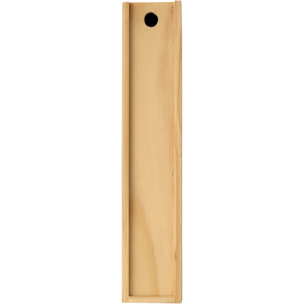 12 színesceruza csúsztatható tetejű fa ajándékdobozban, amelynek a hátoldala vonalzóként is szolgál.