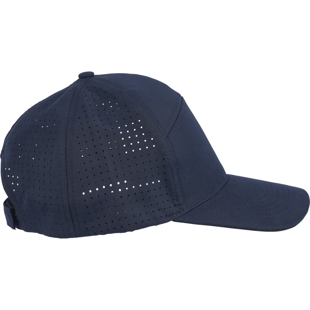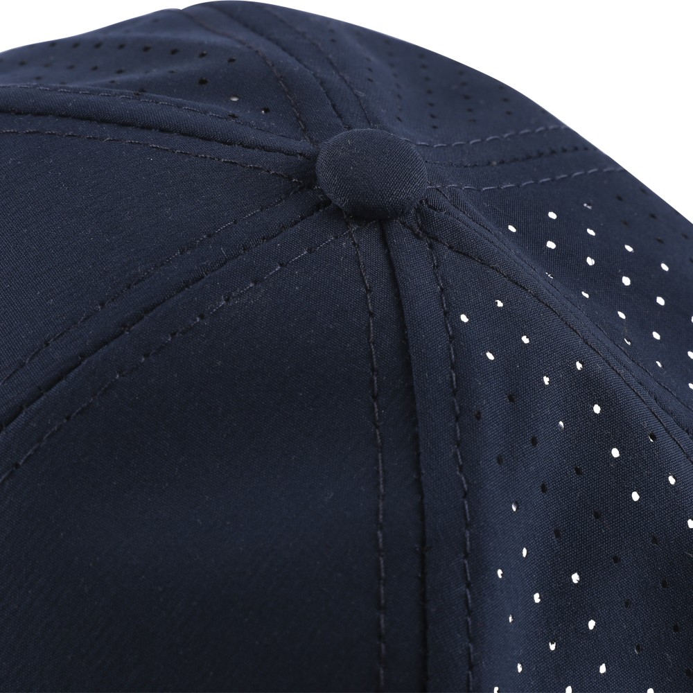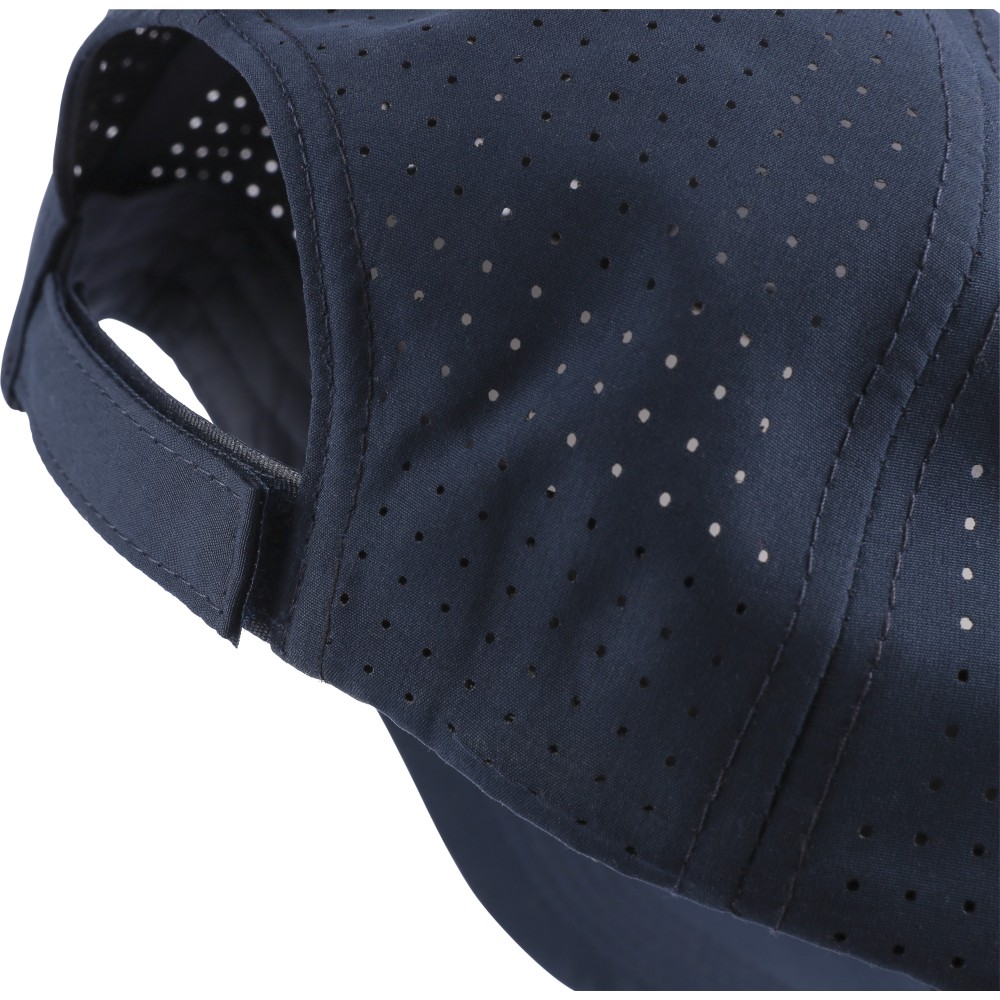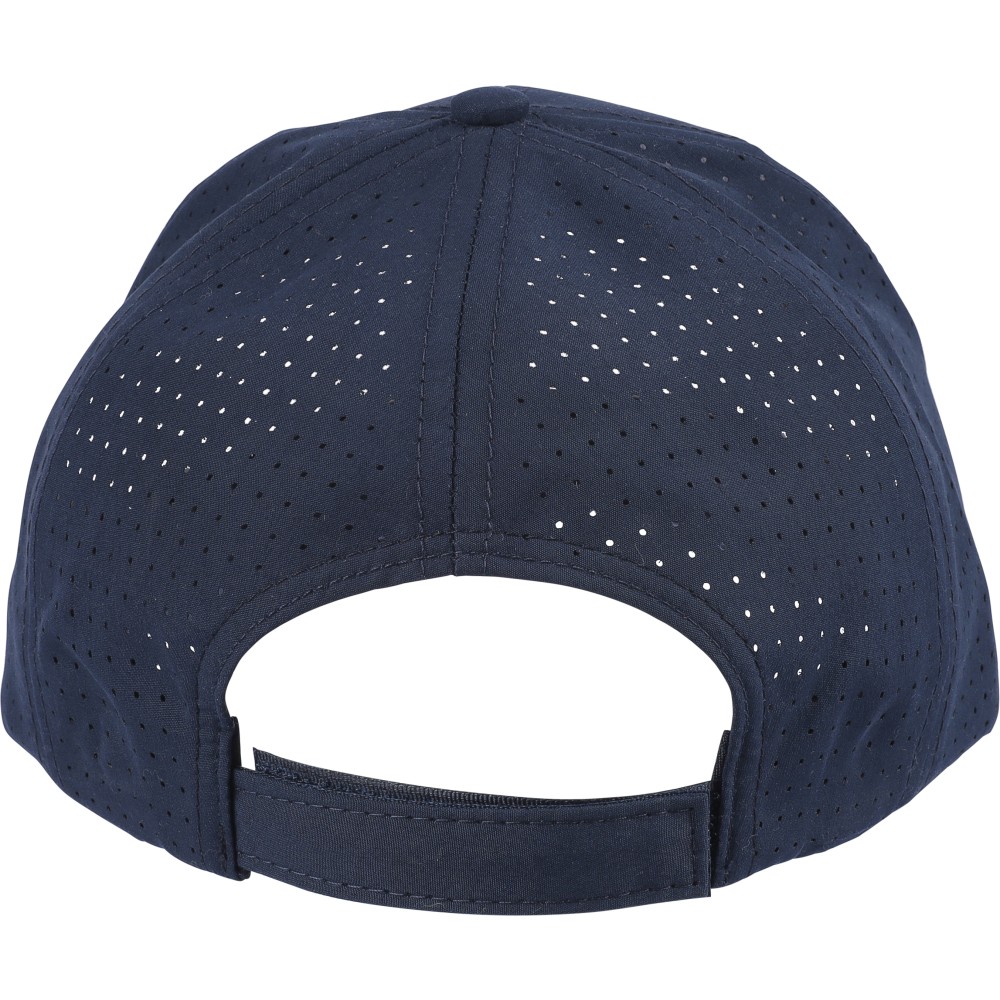 7 paneles poliészter baseballsapka lézervágott szellőzőnyílásokkal a hátsó paneleken. 7 cm-es ellenzővel, tépőzárral állítható pánttal, PU címke nélkül.
