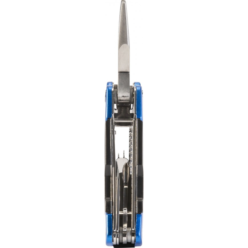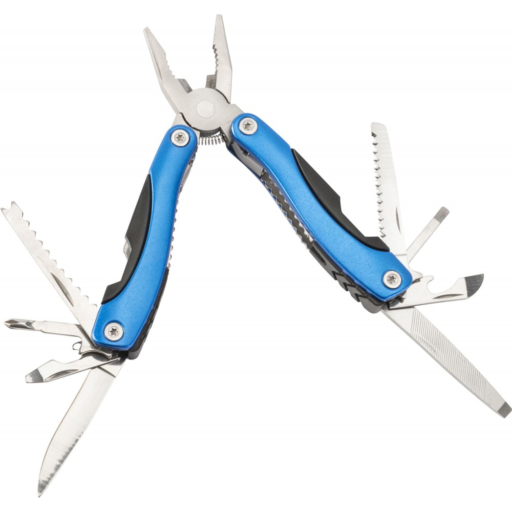 Multifunkciós szerszám. Funkciói: csípőfogó, fűrész, bicska, két csavarhúzó (egy laposfejű és egy Phillips), reszelő, üvegnyitó, halfiléző, diótörő és egy incs beosztású mérő. Tokban érkezik. Alumínium, rozsdamentes acél