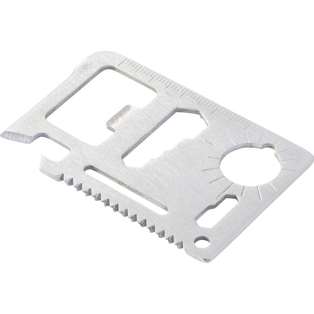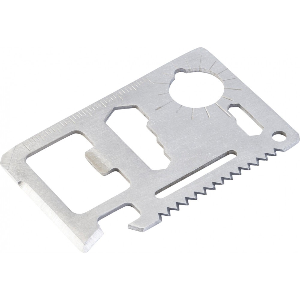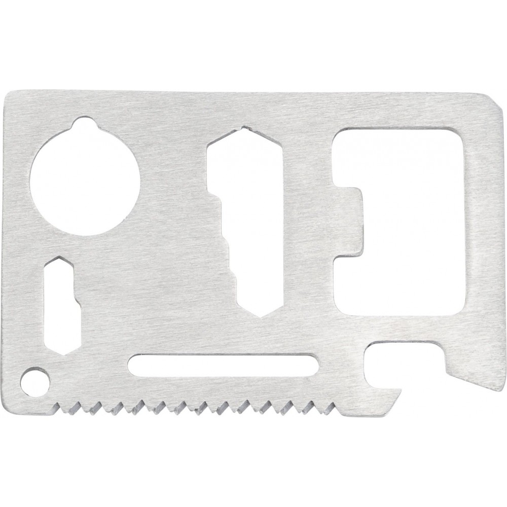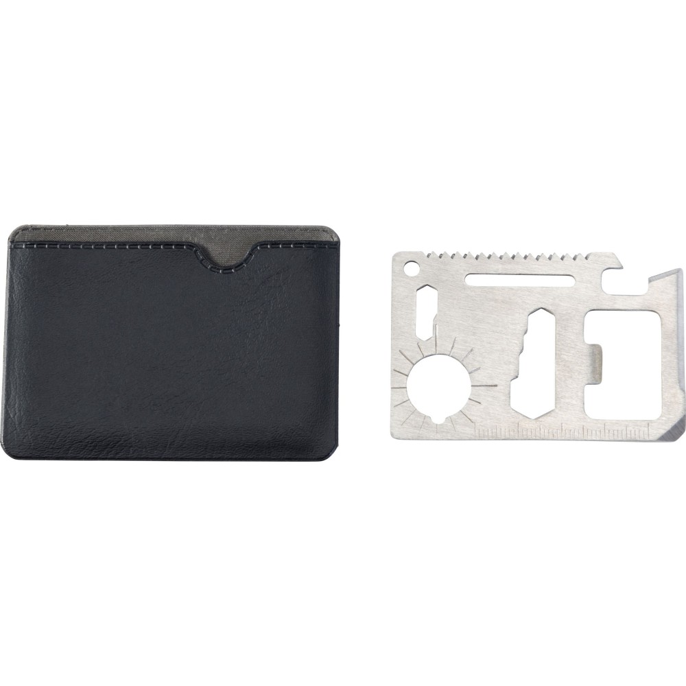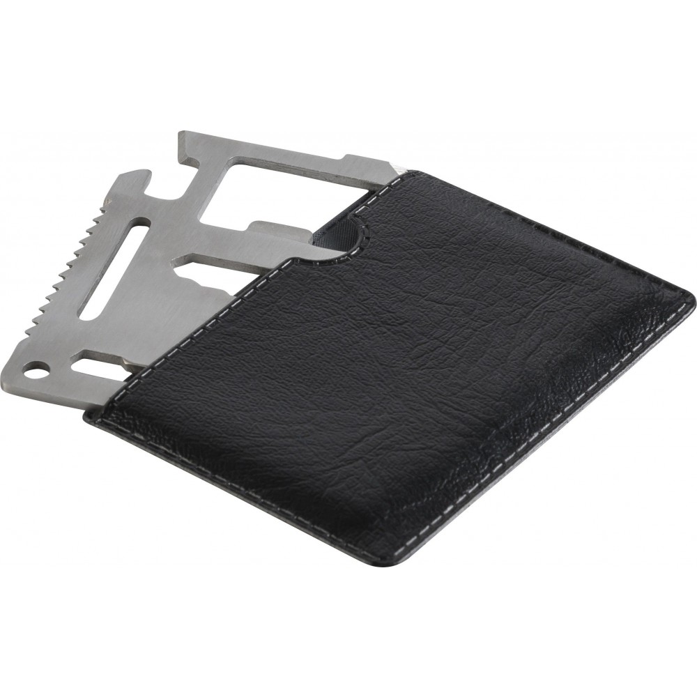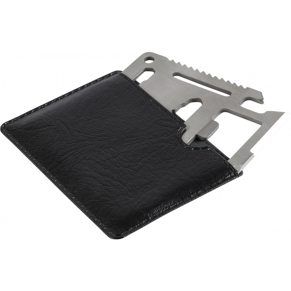 Többfunkciós szerszám 11 funkcióval. Funiciók: kés, doboznyitó, szárnyascsavar, fűrész, csavarhúzó, üvegnyitó, vonalzó és különböző méretű kulcsok. Csomagolása PU tok. rozsdamentes acél