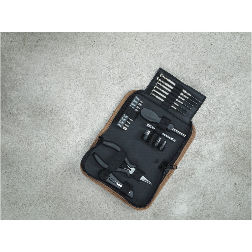 A Spike szerszámkészlet egyetlen gyönyörű csomagban egyesíti a praktikumot, a tartósságot és a fenntarthatóságot. Parafa tárolótokja nem csak látványos, hanem környezetbarát is, anélkül, hogy minőségben kompromisszumot kötne. A tasak belsejében 24 alapvető eszköz található szénacélból és RCS-tanúsítvánnyal rendelkező újrahasznosított műanyagból: 1 sniccer a tiszta és pontos vágáshoz, 6 precíziós csavarhúzó a kényes feladatokhoz, 10 bitfej, 1 csavarhúzó kényelmes markolattal, 1 hosszabbító rúd a nehezen elérhető helyekhez, 4 végfej különféle feladatokhoz és 1 fogó. Mivel a parafa természetes alapanyag, előfordulhatnak szín- és méretbeli eltérések, ami befolyásolhatja a végső emblémázási eredményt. Fenntartható forrásból származó STAC díszdobozba csomagolva.
