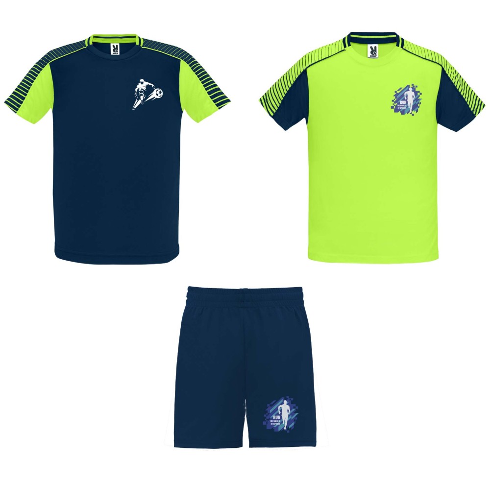 A szett 2 pólóból és 1 rövidnadrágból áll. A pólók színe ellentétes. Technikai és légáteresztő anyag. Pólók fél-raglán ujjal, kerek nyakkal. Rövidnadrág gumis derékkal, azonos színű húzózsinórral és biztonsági varrással, kontrasztos oldalcsíkkal és oldalsliccel. Eltávolítható címke.