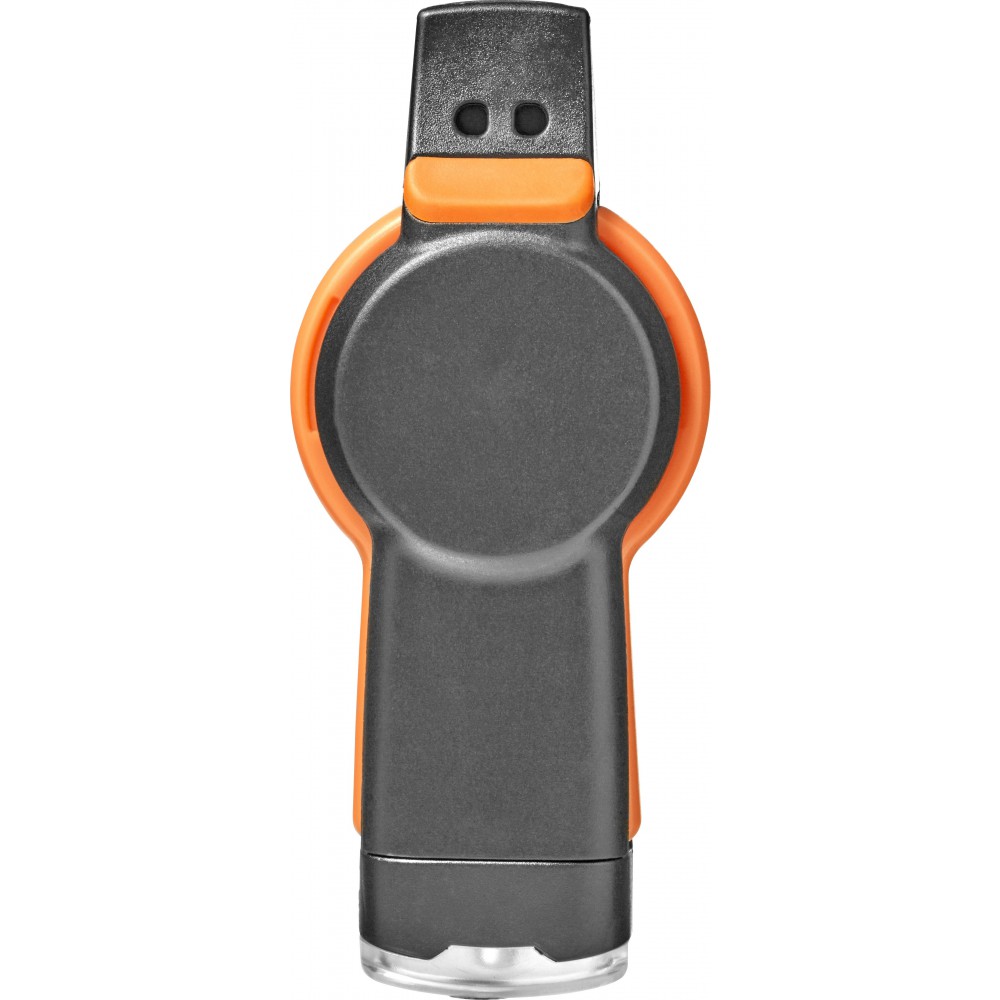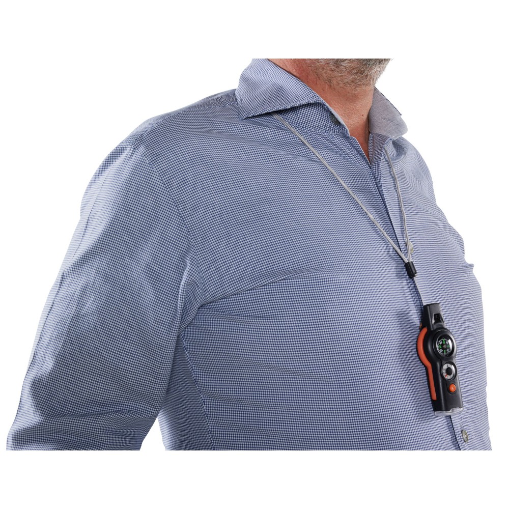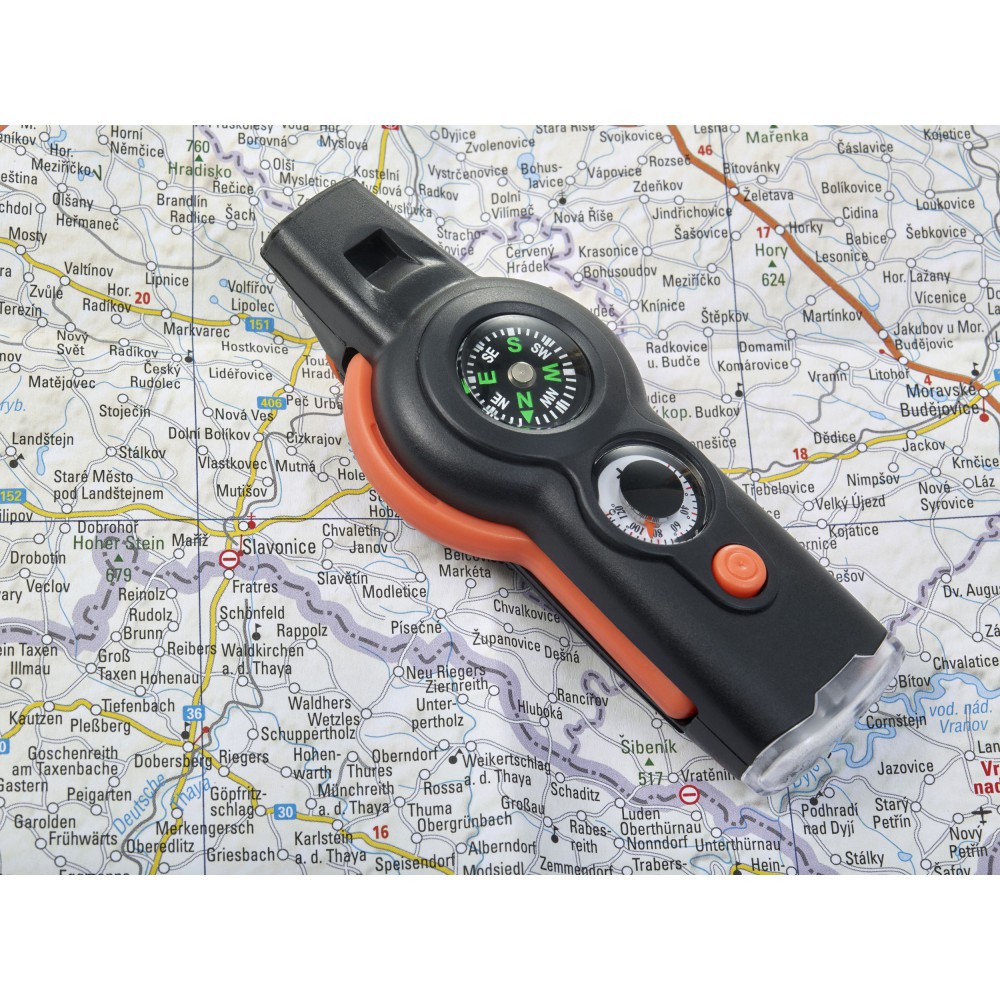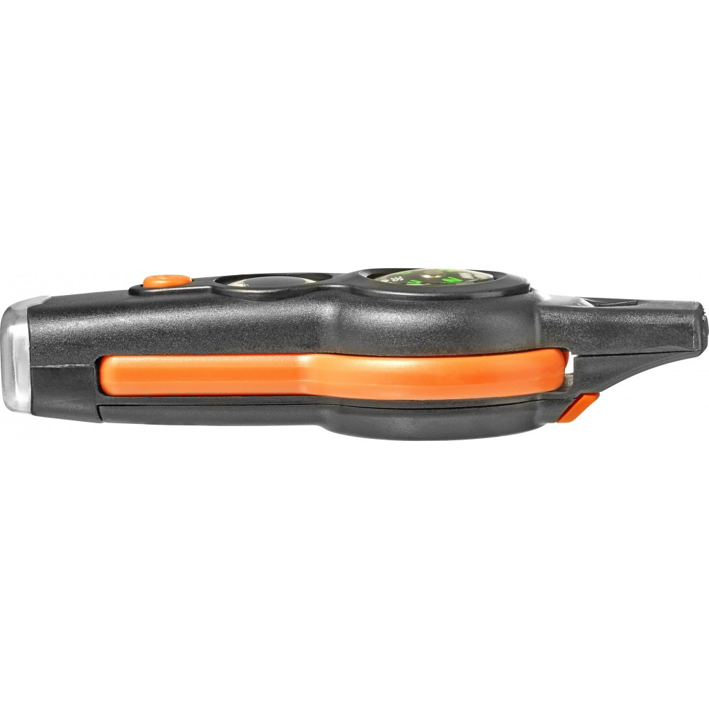 Többfunkciós túlélőeszköz. Az eszköz a következőket tartalmazza: síp, iránytű, hőmérő (° C és ° F), lámpa, tükör, nagyító és zsinór biztonsági zárral. ABS műanyag.