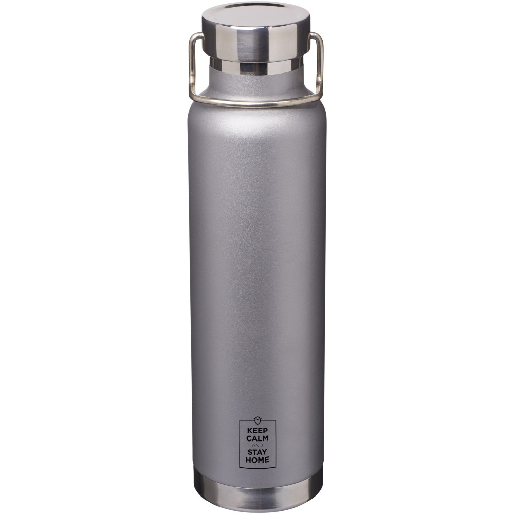 Thor duplafalú vákumos palack. Belső fala réz, ennek köszönhetően 48 órás hideg- és 12 órás melegtartási képességgel rendelkezik. Ez a kialakítás megakadályozza a kondenzációt a palack külső falán. A termoszhoz csavaros, rozsdamentes acél kupak tartozik. Széles kiöntő nyílással rendelkezik, amely akár jégkockák behelyezésére is alkalmas. Szivárgásmentes. Szénsavas italokkal nem használható. Mosogatógépben nem mosható és mikrohullámú sütőben történő melegítésre nem alkalmas. Űrtartalom: 650 ml. Csomagolása Avenue díszdoboz. Rozsdamentes acél.