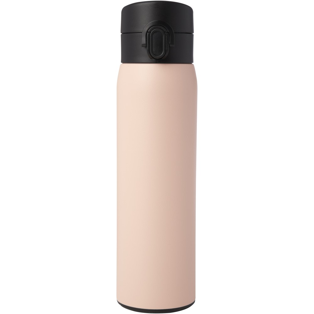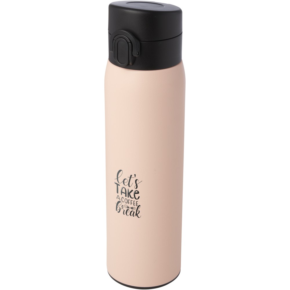 Stílusos, RCS tanúsítvánnyal rendelkező újrahasznosított rozsdamentes acélból készült, szigetelt palack gombos nyitómechanizmussal. A flaska szivárgásmentes és a réz vákuumszigetelésnek köszönhetően az italokat több órán keresztül forrón vagy hidegen tartja. Űrtartalom: 450 ml. Újrahasznosított kartonból készült díszdobozban szállítjuk.