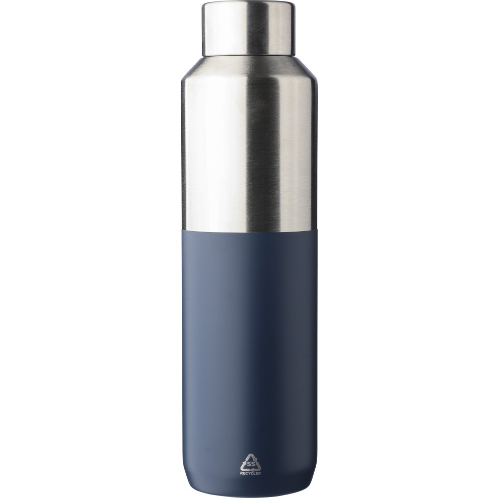 Újrahasznosított rozsdamentes acél palack, 600 ml. Duplafalú, vákuumszigetelt, a belső 304-es, a külső pedig 201-es rozsdamentes acélból készült. Kupakja PP, 201-es rozsdamentes acél külsővel. Elején gravírozott újrahasznosított logó található. Csomagolása barna papírdoboz.