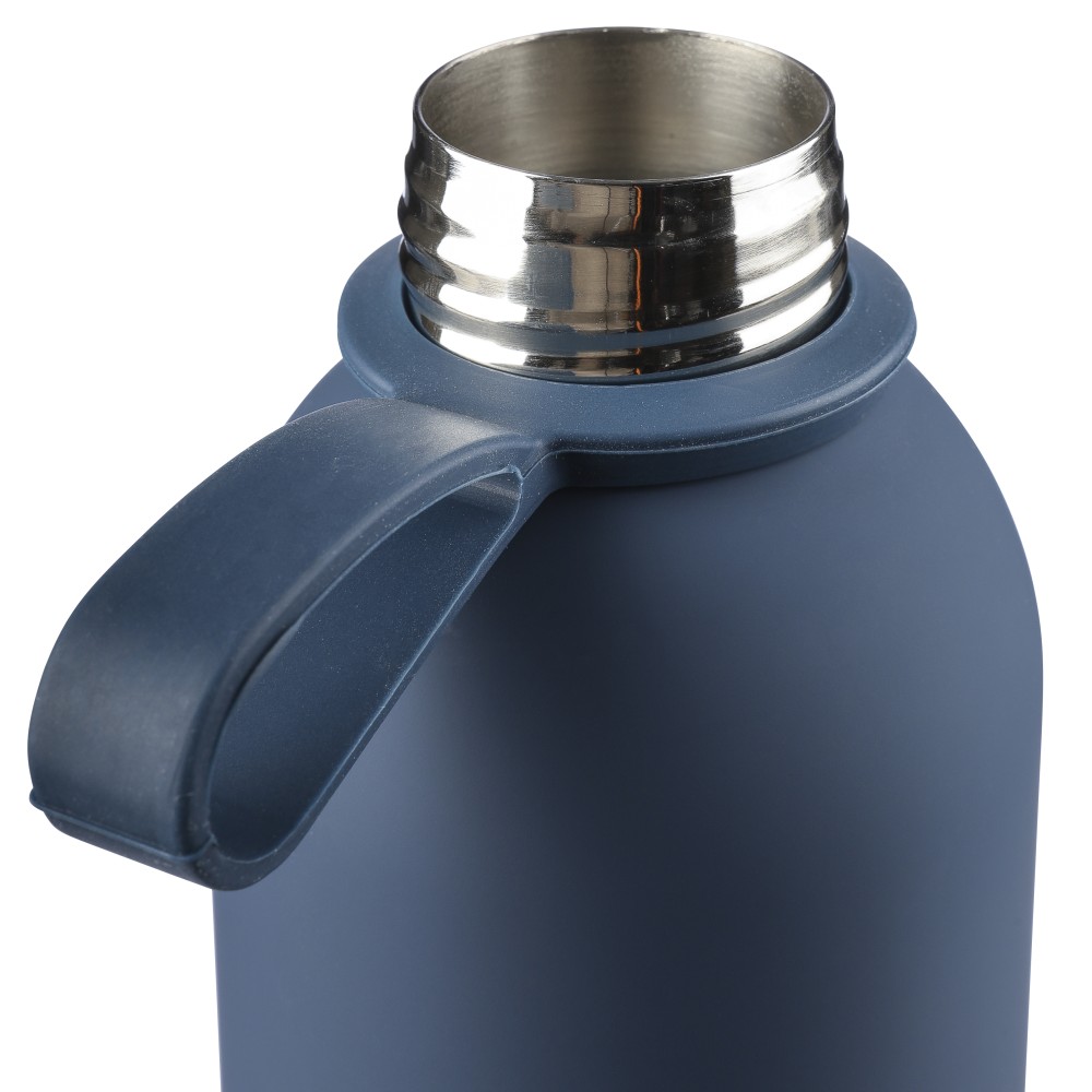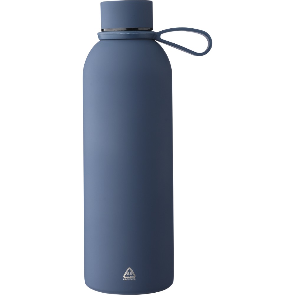 Újrahasznosított rozsdamentes acélból készült duplafalú vákuumpalack, 500 ml-es. 304-es rozsdamentes acél belsővel és 201-es rozsdamentes acél külsővel. Gumírozott felülettel, fém díszítésű csavaros PP kupakkal és szilikon hordfüllel. Gravírozott, újrahasznosított logóval. Csomagolása barna papírdoboz.