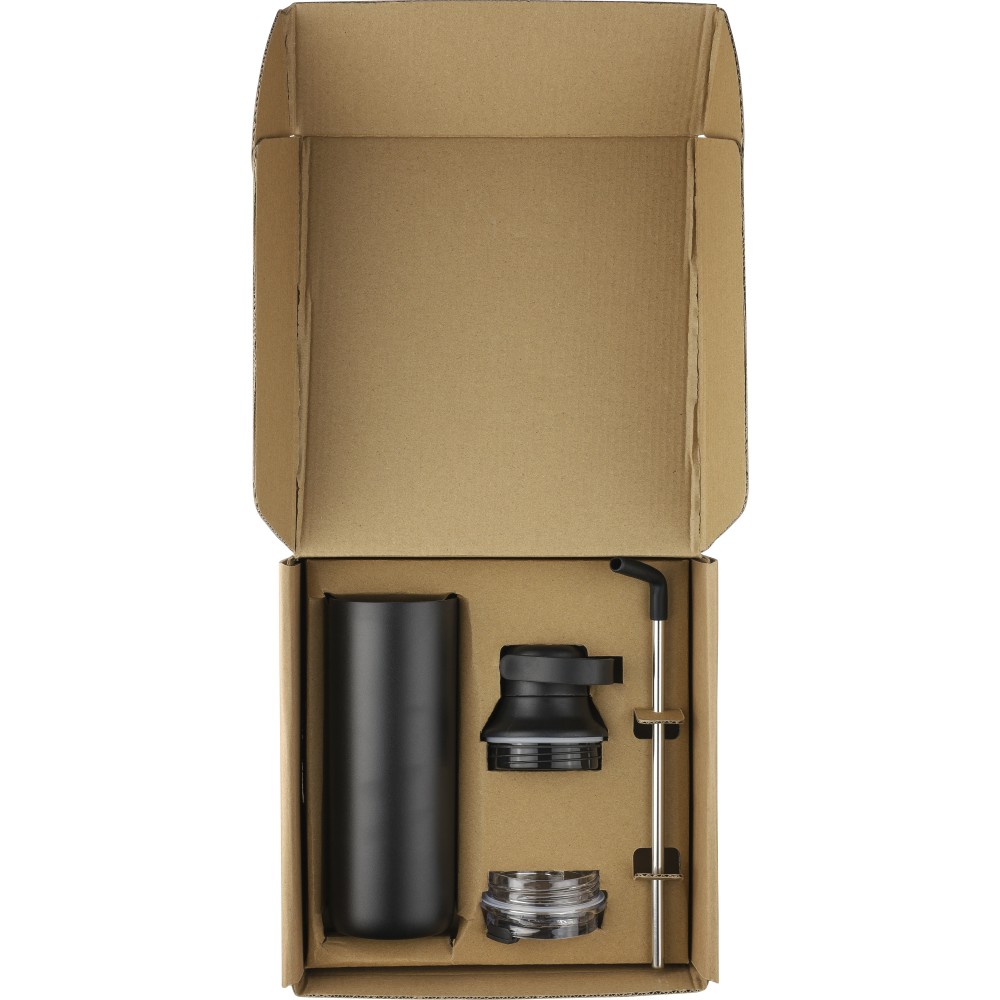 Duplafalú rozsdamentes acél kulacs (500 ml), belső anyaga 304-es rozsdamentes acél, külső része pedig 201-es rozsdamentes acél. Két tetővel szállítjuk: egy hordozófüles PP tetővel és egy átlátszó PS tetővel, amely a mellékelt rozsdamentes acél szívószállal, szilikon véggel és tartóval használható. Egyenként csomagolva, barna kartondobozban.