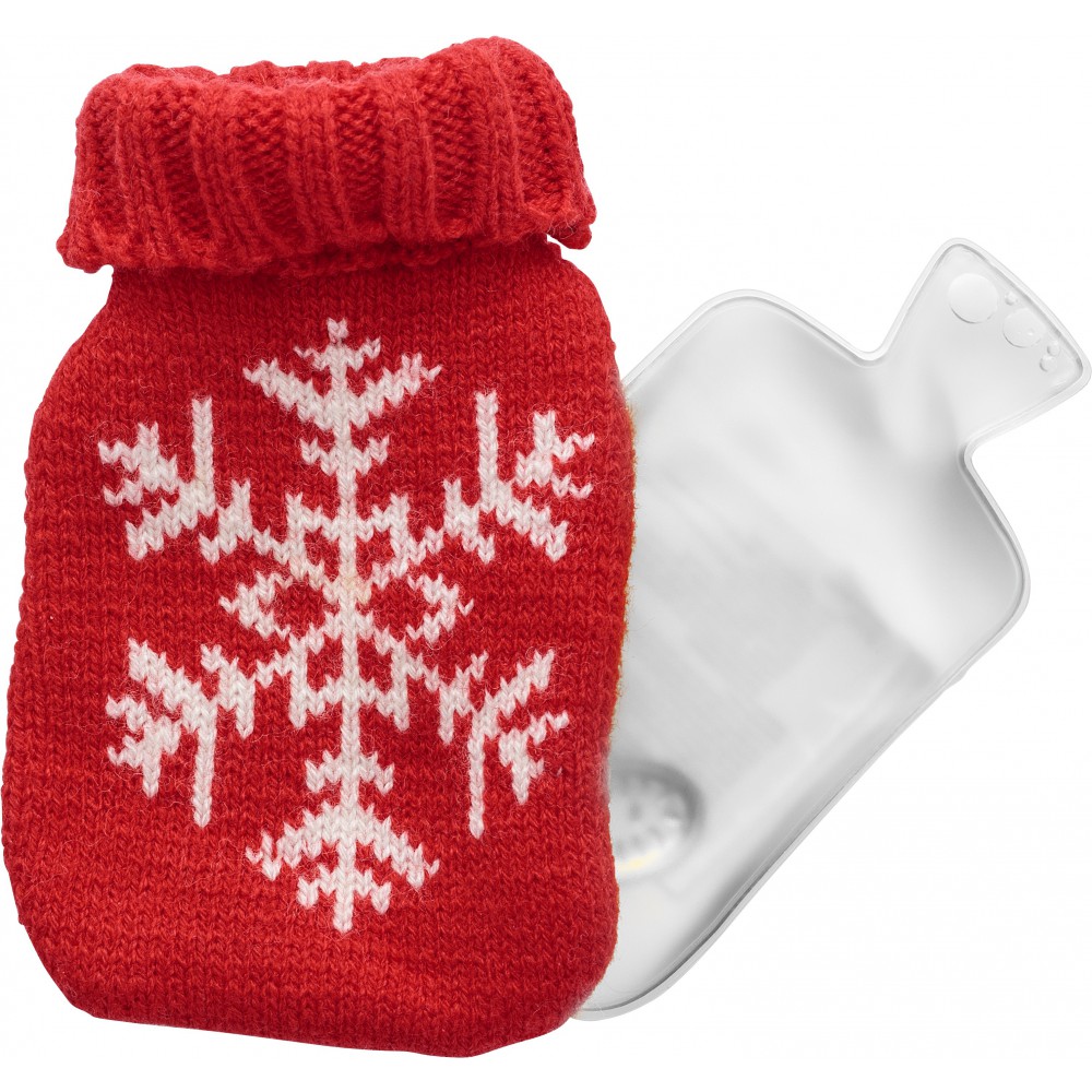 Melegítőtasak hópihe mintás, kötött bevonattal. A fémkorong többszöri megnyomásával aktiválható. Újbóli használat előtt tegyük 6-8 percre forró vízbe, amíg a tasakban lévő folyadék áttetszővé nem válik. PVC.