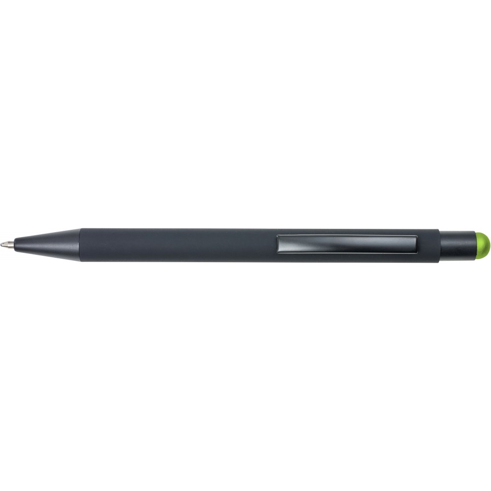 Golyóstoll színes érintővel, kék tollbetéttel és színes belső felülettel. ABS műanyag és alumínium.
